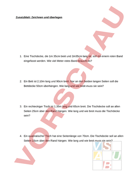 Zusatzblatt: Zeichnen und überlegen 1. Eine Tischdecke, die 1m 35cm breit und 2m35cm lang ist, soll mit einem roten Band eingefasst werden. Wie viel Meter rotes Band braucht es? 2. Ein Bett ist 2.10m lang und 90cm breit. Nur an den beiden langen Seiten soll die Bettdecke 50cm überhängen. Wie lang und wie breit muss sie sein? 3. Ein rechteckiger Tisch ist 1.35m lang und 65cm breit. Die Tischdecke soll an allen Seiten 25cm über den Rand hängen. Wie lang und wie breit muss die Tischdecke sein? 4. Ein quadratischer Tisch hat eine Seitenlänge von 70cm. Die Tischdecke soll an allen Seiten 15cm über den Rand hängen. Wie lang und wie breit muss sie sein? 5. Verwandle in Meter und Zentimeter: A. 150 cm 175 cm 867 cm B. 3 250 cm 4 110 cm 5 511 cm C. 70 cm 120 cm 342 cm 235 cm 74 cm 199 cm 34 cm 231 cm