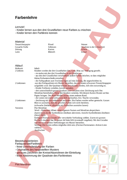 Farbenlehre Lernziel: Kinder lernen aus den drei Grundfarben neue Farben zu mischen Kinder lernen den Farbkreis kennen Material: Tonzeichenpapier Gouache Farbe Zeitung Leim Pinsel Schürzen Karton Bleistift Wasser Quadrate in der Grösse 6x6 Schere Lineal Ablauf: Richtzeit 2 Lektion 2 Lektionen 2 Lektionen Variation Inhalt Kindern werden die drei Grundfarben Rot, Gelb, Blau zur Verfügung gestellt. sie malen mit den drei Grundfarben je ein Quadrat aus. aus den drei Grundfarben verschiedene andere Farben mischen, so dass möglichst kleine Farbunterschiede entstehen. die Farbquadrate zum Trocknen legen auf eine Zeitung, die angeschrieben ist. -aus den Farbquadraten ein Muster herstellen, das auf einem schwarzen Tonzeichenpapier aufgeklebt wird. Die Quadrate können zerschnitten werden, falls dies notwendig ist. Kinder Farbkreis verteilen, korrekt anmalen. drei unterschiedlich grosse Quadrate zum Gestalten einer Zeichnung nach Piet Mondrian bereithalten. Diese den Kindern verteilen. Mit diesem Karton Muster auf das Papier bringen. Der Rand berührt immer einen anderen Rand. die Linien mit einem schwarzen Stift nachziehen. Evt. Touche verwenden. Zeichnung mit Sekundärfarben ausmalen. Die Farben werden selber gemischt. Ganzes Blatt so ausmalen, dass die gleichen Farben sich nicht berühren. (schwache Zeichner allenfalls mit Farbstiften ausmalen lassen) Piet Mondrian Word – Dokument öffnen: unter eigenem Namen und Mondrian abspeichern. Zuerst musst du die Symbolleiste Zeichnen aktivieren. Ansicht-Symbolleisten-Zeichnen (Word 2003) Einfügen-Formen: Gerade oder verwinkelte Verbindung wählen. Zuerst ein grosses Rechteck machen, das die ganze A4 Seite füllt (eventuell vorgeben). Mit den Geraden und den verwinkelten Verbindungen ein Muster herstellen. Wichtig: Die Linien sollten möglichst dick sein. (Format-Formenarten- dickste Linie wählen) Ausdrucken Bewertungskriterien: Farbquadrate/Farbkreis feine Unterscheidung der Farben Originalität des hergestellten Musters genaues Zeichnen der Kreise/Abzeichnen der Einteilung feine Abstimmung der Quadrate des Farbkreises Piet Mondrian exaktes Ausmalen Farbenmischung Darstellung der Quadrate deckendes Malen