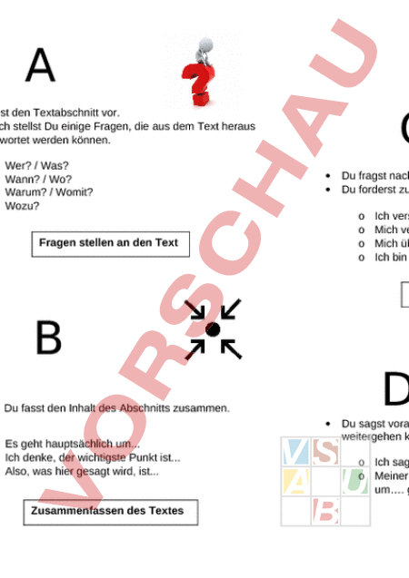 A • • Du liest den Textabschnitt vor. Danach stellst Du einige Fragen, die aus dem Text heraus beantwortet werden können. o o Wer? Was? Wann? Wo? Warum? Womit? Wozu? • • Du fragst nach Worterklärungen. Du forderst zur Erläuterung unklarer Teststellen auf. o o Fragen stellen an den Text Ich verstehe nicht, warum, wie, was. Mich verwirrt, dass Mich überrascht, dass Ich bin nicht sicher, ob Klären von Unklarheiten • Du fasst den Inhalt des Abschnitts zusammen. • Es geht hauptsächlich um. Ich denke, der wichtigste Punkt ist. Also, was hier gesagt wird, ist. Zusammenfassen des Textes Du sagst voraus, wie der Text weitergehen könnte Ich sage voraus, dass Meiner Meinung nach wird es im nächsten Abschnitt um. gehen. Ich denke, dies ist ein Text über Vorhersagen des Textinhalts • • Du liest den Textabschnitt vor. Danach stellst Du einige Fragen, die aus dem Text heraus beantwortet werden können. o o • • Wer? Was? Wann? Wo? Warum? Womit? Wozu? Du fragst nach Worterklärungen. Du forderst zur Erläuterung unklarer Teststellen auf. o o Ich verstehe nicht, warum, wie, was. Mich verwirrt, dass Mich überrascht, dass Ich bin nicht sicher, ob Fragen stellen an den Text Klären von Unklarheiten • Du fasst den Inhalt des Abschnitts zusammen. Es geht hauptsächlich um. Ich denke, der wichtigste Punkt ist. Also, was hier gesagt wird, ist. Zusammenfassen des Textes • Du sagst voraus, wie der Text weitergehen könnte Ich sage voraus, dass Meiner Meinung nach wird es im nächsten Abschnitt um. gehen. Ich denke, dies ist ein Text über Vorhersagen des Textinhalts