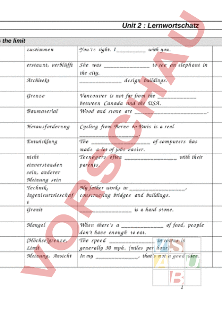 Unit 2 Lernwortschatz The skys the limit zustim e Youre right. with you. erstaunt, verblüfft Sh was to se an elep a nt in the city. de si gn buildings. Architekt Grenz Baum at erial Herau sford run Entwicklung nicht einv er stand n sein, and er r Meinung sein Te h nik, Ingeni urwis c af Granit Mang el (Höch st)gr nz , Limit Meinung, Ansicht Vanc ouv r is not far from the betwe n Canad and the USA. Wood and ston are . Cycling from Bern to Paris is real . The of co p ut er has mad a lot of jobs ea si er. Te n g r often with their parents. My father works in, con structing bridg s and building s. is hard ston . When theres of food, pe pl dont hav enou h to eat. The sp e in towns is gen r ally 30 mph. (mile per hour) In my, thats not good idea. 1 nach aus e sich qualifizieren als, gelten als sich nied erla s n Wolkenkratzer Rau m, Platz Start in the centre of the circle and mov . 50 year old do s nt as child. Many pe opl want to in New York, but there arent enou h flats. is very tall building. Stahl Can you mak for anoth er table is m etal. häs slich This hous is not be autiful its. nach ob n, aufwärts Plants grow toward the light. Unit 2 Lernwortschatz 2 On the outside Firma, Unterne m n bau n Hirsch Sh works for car . Design, Entwurf, Muster Mod like the of this car. Gründ er Walter Chrysl er was the of the Chrysl er Corp oration. dont want to wear my grand oth r old coat. It is so. like the colour of you pullover but dont like the . Dont you e Im your cou sin. You e of my broth er. He has the sa e laugh as you. altmodi c Muster erk nn n erinnern an Turm pitze The Flatiron Building was con structe in 1902. Bam bi is young. Art Dec was in in the 1920 s. You can se the church from far away. Unit 2 Lernwortschatz and on the inside Weck r Every morning my go s off at sev n oclock. 3 e s l Fauteuil Haupt zentral entwerfen Esszim e zeichn n Ankleid erau Stockw erk (Fus )bod n Grundris (eine Ge ä d s Gäst ezi m r Haartrockn er, Föhn unm ö glich Wasc hkü h Lichtsch alter Musikzim e Übersic ht Spi elzim e bev orzug n An is co mfortabl chair you often find by fireplac . The roo is the central roo of hous . Architects building s. We always hav dinner in the. Can you picture of hors ? Sh always gets chang d in her . live on the 10th . Dont throw your cloth s on the Put the on chair. sh ow the roo s of hous from abov . Why dont you stay for the night You can sle p in the . Your hair is wet. Use efore you go out. Its to read with clos d ey s Our washing mac hin is in the. Its so dark, cant find the A a roo where you can play mu si al instrum nt. This map give you an of our city. Dont play in the kitche n, children Go to the. like tennis but bad minton. 4 Trep e Sonn n brille Zahnbürst He always runs down the when hes late. prote ct your ey s from bright sunlight. You clean your teeth with . Unit 2 Lernwortschatz An architectural tour of the Big Apple dann, dana h He went to sup er ark et. , he went to bak ery. Kofferrau Could you put your bag in the of the car, plea e Säul Gre k templ s are built with sev r al. sich winden, sich Children often up into ball when einrollen, sich they sle p / My hair isnt straight it lock n . 5 Jetzig ge e w ä rtig, aktuell enor m, riesig Auss n e it Fas a e Vord rseite schlie slic h, schlus e dlich zuerst (Etag n )w h nu g, Mietwohnung Erdg s h s riesig Lift Lastwag n Marmor dann, gleich arauf Trottoire auffällig dann, dana h My old job was boring but my job is very intere sting The e windows arent just big theyre . The of building is what you se from outsid e. Ther is graffiti on the of this building. hav finish d that book you lent e. In the morning I get ready , then hav bre akfast. live in, not hous . The of building is on stre et level. The Empire State Building is . Its 381 high. Im tired of walking up the e stairs. Lets take the You us a to transp ort large obje cts. The Taj Mahal is mad of. First, went shop ping. , had lunch with my friend. So e ti e you hav to walk on the road if there is no . This building is very . Its not like all the others. Walk straight on for 50 etre , turn left. 6 7