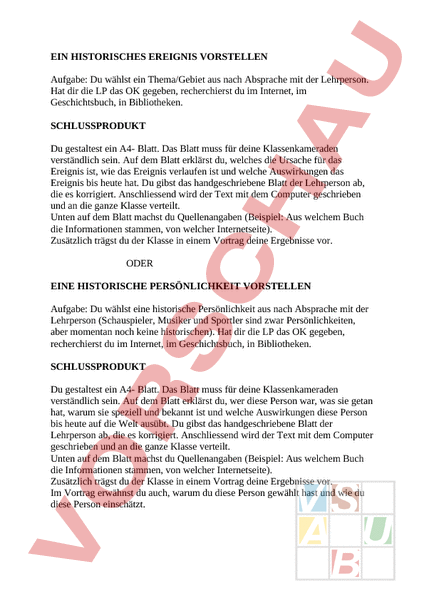 EIN HISTORISCHES EREIGNIS VORSTELLEN Aufgabe: Du wählst ein Thema/Gebiet aus nach Absprache mit der Lehrperson. Hat dir die LP das OK gegeben, recherchierst du im Internet, im Geschichtsbuch, in Bibliotheken. SCHLUSSPRODUKT Du gestaltest ein A4- Blatt. Das Blatt muss für deine Klassenkameraden verständlich sein. Auf dem Blatt erklärst du, welches die Ursache für das Ereignis ist, wie das Ereignis verlaufen ist und welche Auswirkungen das Ereignis bis heute hat. Du gibst das handgeschriebene Blatt der Lehrperson ab, die es korrigiert. Anschliessend wird der Text mit dem Computer geschrieben und an die ganze Klasse verteilt. Unten auf dem Blatt machst du Quellenangaben (Beispiel: Aus welchem Buch die Informationen stammen, von welcher Internetseite). Zusätzlich trägst du der Klasse in einem Vortrag deine Ergebnisse vor. ODER EINE HISTORISCHE PERSÖNLICHKEIT VORSTELLEN Aufgabe: Du wählst eine historische Persönlichkeit aus nach Absprache mit der Lehrperson (Schauspieler, Musiker und Sportler sind zwar Persönlichkeiten, aber momentan noch keine historischen). Hat dir die LP das OK gegeben, recherchierst du im Internet, im Geschichtsbuch, in Bibliotheken. SCHLUSSPRODUKT Du gestaltest ein A4- Blatt. Das Blatt muss für deine Klassenkameraden verständlich sein. Auf dem Blatt erklärst du, wer diese Person war, was sie getan hat, warum sie speziell und bekannt ist und welche Auswirkungen diese Person bis heute auf die Welt ausübt. Du gibst das handgeschriebene Blatt der Lehrperson ab, die es korrigiert. Anschliessend wird der Text mit dem Computer geschrieben und an die ganze Klasse verteilt. Unten auf dem Blatt machst du Quellenangaben (Beispiel: Aus welchem Buch die Informationen stammen, von welcher Internetseite). Zusätzlich trägst du der Klasse in einem Vortrag deine Ergebnisse vor. Im Vortrag erwähnst du auch, warum du diese Person gewählt hast und wie du diese Person einschätzt. BEWERTUNG Selbständigkeit Themenwahl selbständiges und engagiertes Arbeiten Schlussprodukt: Aussehen, Sorgfalt Auftragserfüllung Abgabedatum eingehalten Korrektheit der Angaben inkl. Quellenangaben Verständlichkeit der Angaben Vortrag (Stichworte auf Karteikarten, handgeschrieben, Dauer: 2-3 Minuten) Ablesen gibt Abzug, freies Sprechen ist erwünscht!