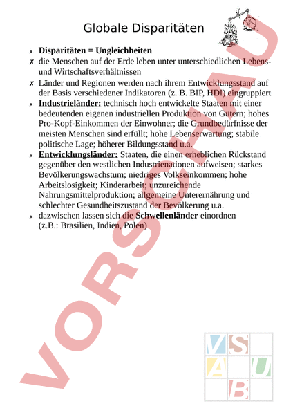 Globale Disparitäten Disparitäten Ungleichheiten die Menschen auf der Erde leben unter unterschiedlichen Lebensund Wirtschaftsverhältnissen Länder und Regionen werden nach ihrem Entwicklungsstand auf der Basis verschiedener Indikatoren (z. B. BIP, HDI) eingruppiert Industrieländer: technisch hoch entwickelte Staaten mit einer bedeutenden eigenen industriellen Produktion von Gütern; hohes Pro-Kopf-Einkommen der Einwohner; die Grundbedürfnisse der meisten Menschen sind erfüllt; hohe Lebenserwartung; stabile politische Lage; höherer Bildungsstand u.a. Entwicklungsländer: Staaten, die einen erheblichen Rückstand gegenüber den westlichen Industrienationen aufweisen; starkes Bevölkerungswachstum; niedriges Volkseinkommen; hohe Arbeitslosigkeit; Kinderarbeit; unzureichende Nahrungsmittelproduktion; allgemeine Unterernährung und schlechter Gesundheitszustand der Bevölkerung u.a. dazwischen lassen sich die Schwellenländer einordnen (z.B.: Brasilien, Indien, Polen)