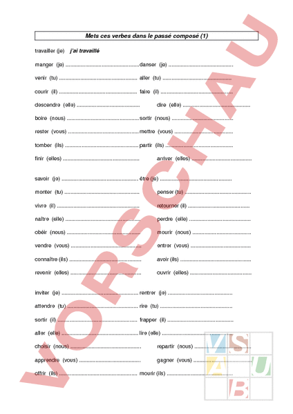 Mets ces verbes dans le passé composé (1) travailler (je) jai travaillé manger (je) .danser (je) . venir (tu) aller (tu) courir (il) faire (il) descendre (elle) dire (elle) . boire (nous) sortir (nous) . rester (vous) . mettre (vous) . tomber (ils) . partir (ils) . finir (elles) . arriver (elles) savoir (je) . être (je) monter (tu) penser (tu) vivre (il) . retourner (il) . naître (elle) perdre (elle) . obéir (nous) . mourir (nous) . vendre (vous) . entrer (vous) connaître (ils) avoir (ils) . revenir (elles) . ouvrir (elles) . inviter (je) . rentrer (je) . attendre (tu) . rire (tu) sortir (il) . frapper (il) aller (elle) . lire (elle) . choisir (nous) . repartir (nous) apprendre (vous) . gagner (vous) . offrir (ils) mourir (ils) écrire (elles) . atterrir (elles)
