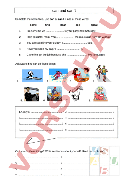 can and cant Complete the sentences. Use can or cant one of these verbs: come find hear see speak 1. Im sorry but we . to your party next Saturday. 2. like this hotel room. You . the mountains from the window. 3. You are speaking very quietly. . you. 4. Have you seen my bag? . it. 5. Catherine got the job because she . five languages. Ask Steve if he can do these things: 1. 2. 5. 6. 3. 7. 4. 8. 1. Can you .? 2. . 3. .? 4. . 5. .? 6. ? 7. .? 8. ? Can you do these things? Write sentences about yourself. Use can or cant. 1. 2. . 3. 4. . 5. 6. 7. . 8.