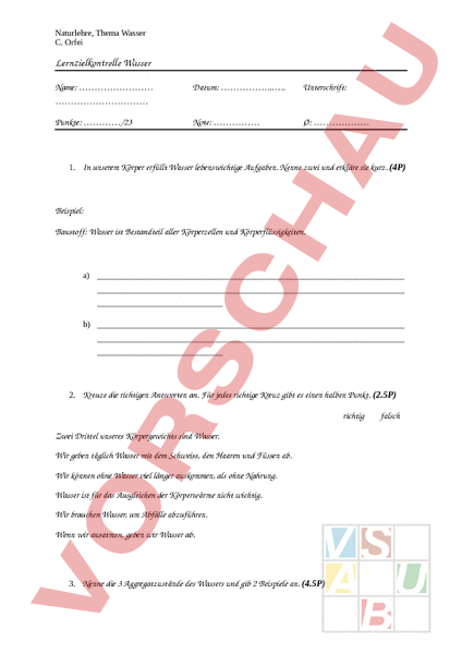 Naturlehre, Thema Wasser C. Orfei Lernzielkontrolle Wasser Name: Datum: Unterschrift: Punkte: /23 Note: Ø: 1. In unserem Körper erfüllt Wasser lebenswichtige Aufgaben. Nenne zwei und erkläre sie kurz. (4P) Beispiel: Baustoff: Wasser ist Bestandteil aller Körperzellen und Körperflüssigkeiten. a) b) 2. Kreuze die richtigen Antworten an. Für jedes richtige Kreuz gibt es einen halben Punkt. (2.5P) richtig Zwei Drittel unseres Körpergewichts sind Wasser. Wir geben täglich Wasser mit dem Schweiss, den Haaren und Füssen ab. Wir können ohne Wasser viel länger auskommen, als ohne Nahrung. Wasser ist für das Ausgleichen der Körperwärme nicht wichtig. Wir brauchen Wasser, um Abfälle abzuführen. Wenn wir ausatmen, geben wir Wasser ab. 3. Nenne die 3 Aggregatzustände des Wassers und gib 2 Beispiele an. (4.5P) falsch Naturlehre, Thema Wasser C. Orfei a) Beispiele: b) Beispiele: c) Beispiele: 4. Füge folgende Begriffe in die Abbildung ein: (2.5P) 97,3% Meere und Ozeane, 2,6% Eis, 0,014% verfügbares Wasser, Salzwasser, Süsswasser 1. 5. 2. 4. 3. 5. Beschreibe, was der Unterschied zwischen echtem und unechtem Grundwasser ist. (2P) 6. Kreuze die richtige Antwort an. (2.5P) richtig Grundwasser bildet sich, wenn Regen in den Boden versickert. Das Regenwasser wird durch die verschiedenen Bodenschichten gereinigt. Das Grundwasser wird mit Brunnenanlagen gewonnen. Um das Grundwasser zu säubern, setzt man Chemikalien und Gift ein. Ein Haus, das an einem Hügel steht, hat kein Wasser, weil das Wasser nicht nach oben befördert werden kann. 7. Nenne 3 Dinge, die den Regen zu saurem Regen machen. (1.5) falsch Naturlehre, Thema Wasser C. Orfei a) b) c) 8. Beschrifte den Kreislauf mit folgenden Wörtern: Grundwasser, Wolke, Sonne, Versickerung, Verdunstung, wasserdurchlässige Erdschicht, wasserundurchlässige Erdschicht (3.5)