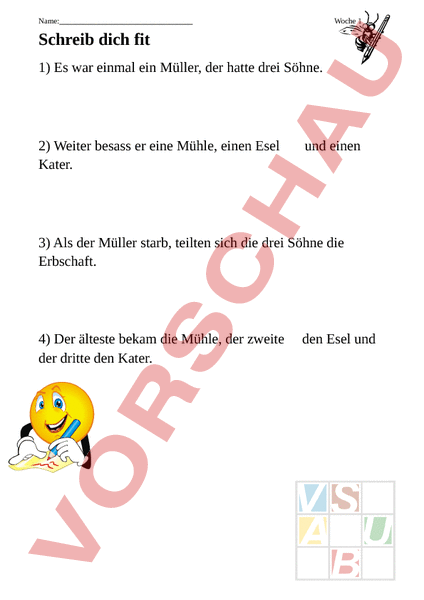 Name: Woche 1 Schreib dich fit 1) Es war einmal ein Müller, der hatte drei Söhne. 2) Weiter besass er eine Mühle, einen Esel Kater. und einen 3) Als der Müller starb, teilten sich die drei Söhne die Erbschaft. 4) Der älteste bekam die Mühle, der zweite der dritte den Kater. den Esel und