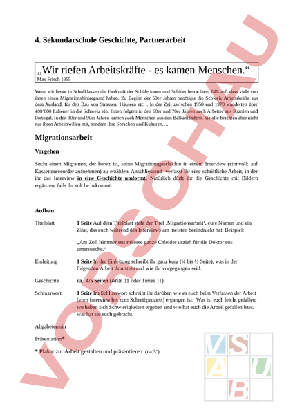 4. Sekundarschule Geschichte, Partnerarbeit „Wir riefen Arbeitskräfte es kamen Menschen. Max Frisch 1955 Wenn wir heute in Schulklassen die Herkunft der Schülerinnen und Schüler betrachten, fällt auf, dass viele von ihnen einen Migrationshintergrund haben. Zu Beginn der 50er Jahren benötigte die Schweiz Arbeitskräfte aus dem Ausland, für den Bau von Strassen, Häusern etc. In der Zeit zwischen 1950 und 1970 wanderten über 400‘000 Italiener in die Schweiz ein. Ihnen folgten in den 60er und 70er Jahren auch Arbeiter aus Spanien und Portugal. In den 80er und 90er Jahren kamen auch Menschen aus den Balkanländern. Sie alle brachten aber nicht nur ihren Arbeitswillen mit, sondern ihre Sprachen und Kulturen. Migrationsarbeit Vorgehen Sucht einen Migranten, der bereit ist, seine Migrationsgeschichte in einem Interview (sinnvoll: auf Kassettenrecorder aufnehmen) zu erzählen. Anschliessend verfasst ihr eine schriftliche Arbeit, in der ihr das Interview in eine Geschichte umformt. Natürlich dürft ihr die Geschichte mit Bildern ergänzen, falls ihr solche bekommt. Aufbau Titelblatt 1 Seite Auf dem Titelblatt steht der Titel ‚Migrationsarbeit‘, eure Namen und ein Zitat, das euch während des Interviews am meisten beeindruckt hat. Beispiel: „Am Zoll hämmer eus müesse ganze Chleider uszieh für die Doktor eus untersueche. Einleitung 1 Seite In der Einleitung schreibt ihr ganz kurz ( bis Seite), was in der folgenden Arbeit drin steht und wie ihr vorgegangen seid. Geschichte ca. 4/5 Seiten (Arial 11 oder Times 11) Schlusswort 1 Seite Im Schlusswort schreibt ihr darüber, wie es euch beim Verfassen der Arbeit (vom Interview bis zum Schreibprozess) ergangen ist: Was ist euch leicht gefallen, wo haben sich Schwierigkeiten ergeben und wie hat euch die Arbeit gefallen bzw. was hat sie euch gebracht. Abgabetermin Präsentation* Plakat zur Arbeit gestalten und präsentieren (ca.3‘)