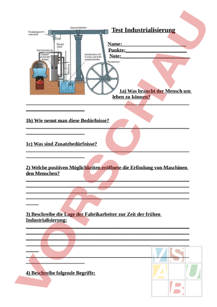 Test Industrialisierung Name:_ Punkte: Note:_ 1a) Was braucht der Mensch um leben zu können? 1b) Wie nennt man diese Bedürfnisse? 1c) Was sind Zusatzbedürfnisse? 2) Welche positiven Möglichkeiten eröffnete die Erfindung von Maschinen den Menschen? 3) Beschreibe die Lage der Fabrikarbeiter zur Zeit der frühen Industrialisierung: 4) Beschreibe folgende Begriffe: Proletarier: Kapitalistische Gesellschaftsordnung:_ Kommunistische Gesellschaftsordnung:_ 5a) Wie war die Lage für die Arbeiter in den Spinnfabriken? 5b) Welche Folgen hatte das für die Gesundheit der Arbeiter? Nenne 6! 6) Nenne 2 Vorteile und 2 Nachteile der Dampfmaschine: 7) Wie hiessen die beiden Begründer der klassenlosen Gesellschaft?
