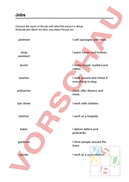 Jobs Connect the name of the job with what this person is doing. Verbinde den Beruf mit dem, was diese Person tut. postman sell sausages and meat. shop assistant paint rooms and houses. doctor make bread, cookies and cakes. teacher walk around and check if everything is okay. policeman look after flowers and trees. taxi driver work with children. butcher work at hospital. baker deliver letters and postcards. gardener drive people around the town. painter work at supermarket.