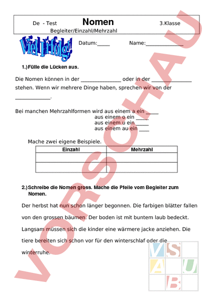 Nomen De Test Begleiter/Einzahl/Mehrzahl Datum:_ 3.Klasse Name:_ 1.)Fülle die Lücken aus. Die Nomen können in der oder in der stehen. Wenn wir mehrere Dinge haben, sprechen wir von der . Bei manchen Mehrzahlformen wird aus einem ein aus einem ein aus einem ein aus einem au ein Mache zwei eigene Beispiele. Einzahl Mehrzahl 2.)Schreibe die Nomen gross. Mache die Pfeile vom Begleiter zum Nomen. Der herbst hat nun schon länger begonnen. Die farbigen blätter fallen von den grossen bäumen. Der boden ist mit buntem laub bedeckt. Langsam müssen sich die kinder eine wärmere jacke anziehen. Die tiere bereiten sich schon vor für den winterschlaf oder die winterruhe. 3.)Welche Nomen stehen in der Einzahl und welche in der Mehrzahl? Schreibe sie mit dem Begleiter in der Einzahl und in der Mehrzahl auf. Brillen Brot Mücken Zweige Auto Nest Einzahl Mehrzahl 4.) Fülle die Tabelle aus. Schreibe den richtigen Begleiter dazu. Einzahl Mehrzahl die Wände der Kopf die Frucht Die Löcher Der Strauch die Tücher Der Frosch Das Kraut die Züge die Träume 5.)Fülle den Lückentext aus. Alle Nomen haben ein grammatisches . Es gibt drei grammatische Geschlechter, nämlich: männlich, und Das Nomen muss in der stehen, damit du das Geschlecht bestimmen kannst. 6.)Setze diese Nomen beim richtigen grammatischen Geschlecht ein. Überlege dir gut, auf was du achten musst. Vergiss die Begleiter nicht. Die Schweine Die Männer Die Probleme Die Fliegen Die Nüsse Die Briefe Die Personen Die Gespenster männliche Nomen weibliche Nomen sächliche Nomen 7.)Wer macht was? Ersetze das Wort „Dings mit einem passenden Tier und schreibe den ganzen Satz auf. Die Dings quaken. Die Dings grunzen. Die Dings wiehern. Die Dings muhen. 8.) Schreibe das passende Nomen mit dem Begleiter zum untenstehenden Wort. a.) rechnen b.) zeichnen c.)glücklich d.) besuchen Wie ist dir der Test gegangen? Punktzahl: Note: Unterschrift:
