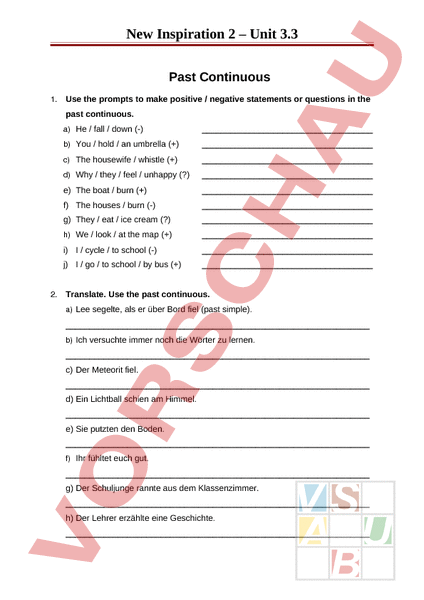 New Inspiration 2 – Unit 3.3 Past Continuous 1. Use the prompts to make positive negative statements or questions in the past continuous. 2. a) He fall down (-) b) You hold an umbrella () c) The housewife whistle () d) Why they feel unhappy (?) e) The boat burn () f) The houses burn (-) g) They eat ice cream (?) h) We look at the map () i) / cycle to school (-) j) / go to school by bus () Translate. Use the past continuous. a) Lee segelte, als er über Bord fiel (past simple). b) Ich versuchte immer noch die Wörter zu lernen. c) Der Meteorit fiel. d) Ein Lichtball schien am Himmel. e) Sie putzten den Boden. f) Ihr fühltet euch gut. g) Der Schuljunge rannte aus dem Klassenzimmer. h) Der Lehrer erzählte eine Geschichte.