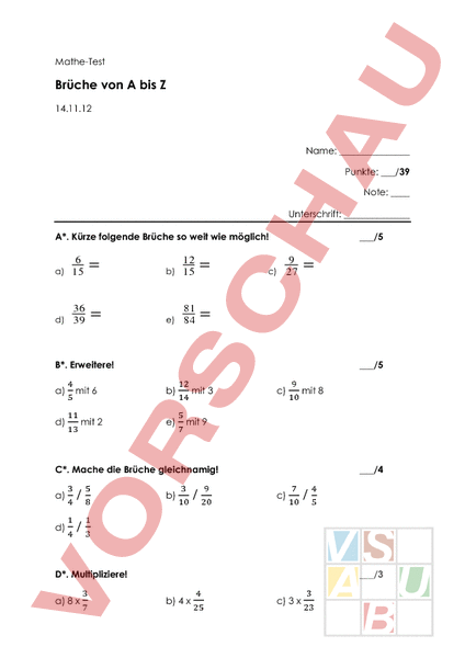Mathe-Test Brüche von bis 14.11.12 Name: Punkte:/39 Note: Unterschrift: A*. Kürze folgende Brüche so weit wie möglich! 6 15 b) 12 15 36 d) 39 81 e) 84 a)/5 c) 9 27 B*. Erweitere! a) mit 6 d) mit 2/5 b) e) mit 3 c) mit 8 mit 9 C*. Mache die Brüche gleichnamig! a) d) b)/4 c) D*. Multipliziere! a) 8/3 b) 4 c) 3 E*. Dividiere! :4 a)/3 b) :3 c) :3 D**. Rechne die Terme aus und kürze die Ergebnisse vollständig, wo das möglich ist. Zuerst die Klammern ausrechnen!/3 a) b) (6 )- c) 2 ( 7) E**. Rechne die Terme aus! – 78 cl a) 4/3 b) 5 min min c) 6 cm cm F***. Rechne die Terme aus. Wo nötig, machst du die Brüche zuerst gleichnamig. Kürze die Ergebnisse vollständig. Zuerst die Klammern ausrechnen!/8 a) - b) c) :7 d) 5 G***. Löse die beiden Textaufgaben. a) einer Zahl ist 40. Wie heisst die Zahl? b) Herr Wyss rechnet für das Klassenlager. Reise und je/2 der Ausgaben braucht er für die muss er für die Miete des Hauses und für die Verpflegung einsetzen. Für die übrigen Ausgaben bleiben ihm dann noch 1200 Fr. Mit welchen Gesamtkosten rechnet Herr Wyss?/3