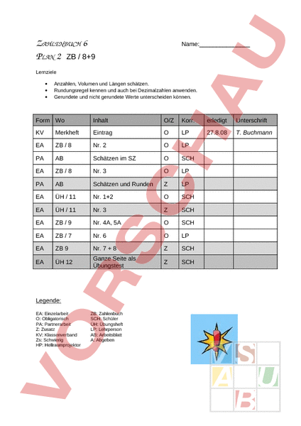 ZAHLENBUCH 6 PLAN 2 ZB 89 Name:_ Lernziele • • • Anzahlen, Volumen und Längen schätzen. Rundungsregel kennen und auch bei Dezimalzahlen anwenden. Gerundete und nicht gerundete Werte unterscheiden können. Form Wo Inhalt O/Z Korr. erledigt Unterschrift KV Merkheft Eintrag LP 27.8.08 T. Buchmann EA ZB 8 Nr. 2 LP PA AB Schätzen im SZ SCH EA ZB 8 Nr. 3 LP PA AB Schätzen und Runden LP EA ÜH 11 Nr. 12 SCH EA ÜH 11 Nr. 3 SCH EA ZB 9 Nr. 4A, 5A SCH EA ZB 7 Nr. 6 LP EA ZB 9 Nr. 7 8 SCH EA ÜH 12 Ganze Seite als Übungstest SCH Legende: EA: Einzelarbeit O: Obligatorisch PA: Partnerarbeit Z: Zusatz KV: Klassenverband Zs: Schwierig HP: Hellraumprojektor ZB: Zahlenbuch SCH: Schüler ÜH: Übungsheft LP: Lehrperson AB: Arbeitsblatt A: Abgeben