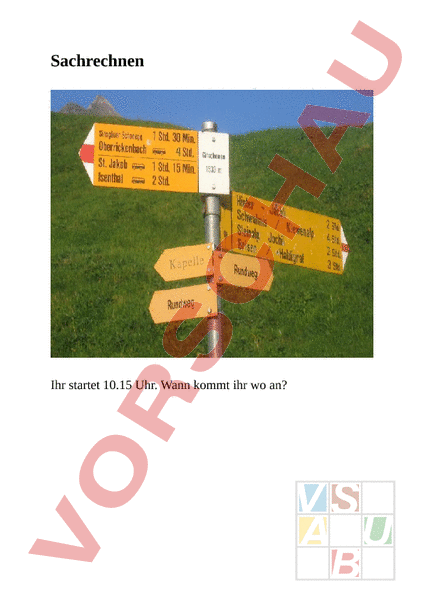 Sachrechnen Ihr startet 10.15 Uhr. Wann kommt ihr wo an? Eine Velotour mit der Familie Was ist eine gute Länge für einen schönen Sonntag? Wie lange seid ihr für diese Distanz ungefähr unterwegs? Welche Geschwindigkeit habt ihr dann? Eine Wanderkarte Wenn auf dieser Karte eine Strecke 8 cm lang ist, wie lange ist sie dann in Wirklichkeit? 12 cm? Wie lange ist eine 20km lange Strecke auf der Karte?