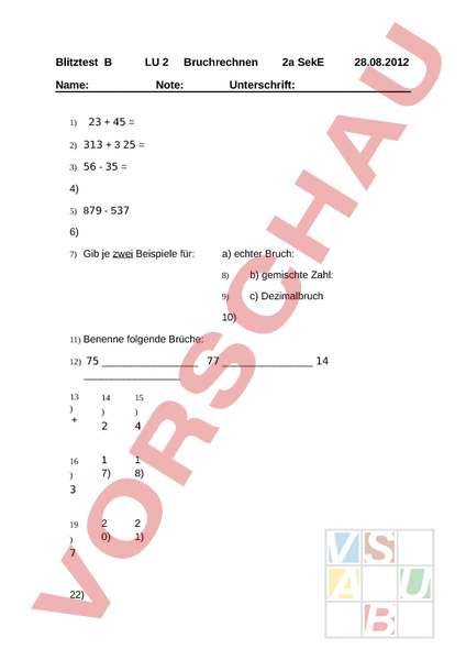 Blitztest LU 2 Name: Bruchrechnen Note: 2a SekE Unterschrift: 23 45 1) 2) 313 3 25 3) 56 35 4) 5) 879 537 6) 7) Gib je zwei Beispiele für: a) echter Bruch: 8) b) gemischte Zahl: 9) c) Dezimalbruch 10) 11) Benenne folgende Brüche: 12) 75 77 14 13 16 14 15 2 4 1 7) 1 8) 2 0) 2 1) 3 19 7 22) 28.08.2012 23) 24) 25) 26) 27 30 28 29 0. 0. 3 1) 3 2) 3 4) 3 5) 0. 33 0. 36) 37) 38) 39) 40) 41) 42) 3 56 4 49 5 23