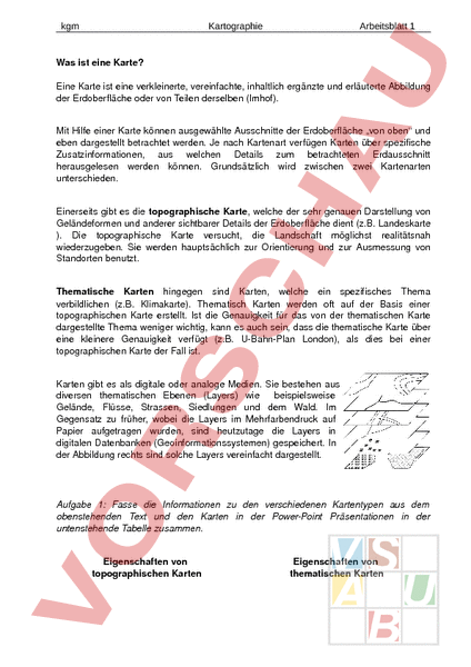 kgm Kartographie Arbeitsblatt 1 Was ist eine Karte? Eine Karte ist eine verkleinerte, vereinfachte, inhaltlich ergänzte und erläuterte Abbildung der Erdoberfläche oder von Teilen derselben (Imhof). Mit Hilfe einer Karte können ausgewählte Ausschnitte der Erdoberfläche „von oben und eben dargestellt betrachtet werden. Je nach Kartenart verfügen Karten über spezifische Zusatzinformationen, aus welchen Details zum betrachteten Erdausschnitt herausgelesen werden können. Grundsätzlich wird zwischen zwei Kartenarten unterschieden. Einerseits gibt es die topographische Karte, welche der sehr genauen Darstellung von Geländeformen und anderer sichtbarer Details der Erdoberfläche dient (z.B. Landeskarte ). Die topographische Karte versucht, die Landschaft möglichst realitätsnah wiederzugeben. Sie werden hauptsächlich zur Orientierung und zur Ausmessung von Standorten benutzt. Thematische Karten hingegen sind Karten, welche ein spezifisches Thema verbildlichen (z.B. Klimakarte). Thematisch Karten werden oft auf der Basis einer topographischen Karte erstellt. Ist die Genauigkeit für das von der thematischen Karte dargestellte Thema weniger wichtig, kann es auch sein, dass die thematische Karte über eine kleinere Genauigkeit verfügt (z.B. UBahnPlan London), als dies bei einer topographischen Karte der Fall ist. Karten gibt es als digitale oder analoge Medien. Sie bestehen aus diversen thematischen Ebenen (Layers) wie beispielsweise Gelände, Flüsse, Strassen, Siedlungen und dem Wald. Im Gegensatz zu früher, wobei die Layers im Mehrfarbendruck auf Papier aufgetragen wurden, sind heutzutage die Layers in digitalen Datenbanken (Geoinformationssystemen) gespeichert. In der Abbildung rechts sind solche Layers vereinfacht dargestellt. Aufgabe 1: Fasse die Informationen zu den verschiedenen Kartentypen aus dem obenstehenden Text und den Karten in der PowerPoint Präsentationen in der untenstehende Tabelle zusammen. Eigenschaften von topographischen Karten Eigenschaften von thematischen Karten [Geben Sie Text ein]