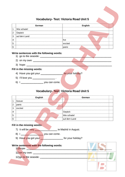 Vocabulary- Test: Victoria Road Unit 5 German 1 Wie schade! 2 Gepäck 3 auf dem Land English 4 hot 5 excited 6 panic Write sentences with the following words: 1) go to the seaside: 2) on my own: 3) hope: Fill in the missing words: 4) Have you got your for your holiday? 5) Ill love you 6) you can come. Vocabulary- Test: Victoria Road Unit 5 English 1 forever 2 panic 3 excited German 4 Gepäck 5 Wie schade! 6 auf dem Land Fill in the missing words: 7) It will be very in Madrid in August. 8) you can come. 9) Have you got your for your holiday? Write sentences with the following words: 10)hope: 11) on my own: 12)go to the seaside: