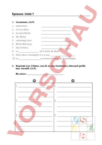 Epreuve: Unité 7 1. Vocabulaire: (10 P) 1. betrachten: 2. Ich bin dafür: 3. Du hast Recht: 4. der Mond: 5. unterwegs sein: 6. Meine Meinung: 7. das Schloss: 8. Le est larbre de Noël. 9. Entre deux montagnes il a une . 10. Lece trouve en haut de la montagne. 2. Begründe in je 3 Sätzen, was dir an einer bestimmten Jahreszeit gefällt, bzw. missfällt. (12 P) Ma saison: 1. 1. 2. 2. 3. 3. 3. Formuliere zu den untenstehenden Verkehrmitteln je zwei Sätze: einen, der für, und einen, der gegen das Verkehrsmittel spricht. (12 P) 1. 2. 3. 4. 5. 6. 4. Les verbes: (157P) Verbes Personnes Temps prendre ils passé composé voir nous présent faire vous présent mettre je présnet sortir elles passé composé aller tu présent voir passé composé faire elle passé composé prendre 2 présent sortir ils présent aller elle passé composé Solutions Fülle die Lücke mit der richtigen Form von „voir aus: Sur cette image, on les montagnes. Est-ce que vous les sommets enneigés? Oui, nous les. Hier, Pierre et Cathrine le glacier. Est-ce que tu l_ aussi? 5. Rahme in diesem Dialog alle pronom objet direct ein und unterstreiche die Wörter, die durch diese Pronomen ersetzt werden: (11 P) A: Dis, Alain, est-ce que tu connais Claire Bachy, la fille du boulanger? B: Oui, unpeu, mais je ne la vois pas souvent. A: Et ses frères? B: Je les connais bien; je les vois tous les jeudis soir au club de tennis. A: Ah, ils jouent au tennis? B: Oui, ils jouent même très bien. Lannée dernière. il a eu un grand tournoi international junior à Lausanne, eh bien cest José et Marc qui lont gagné en double. A: Et tu les connais bien, les frères Bachy? B: Oui, nous sommes de vieux amis. Pourquoi? A: Parce que leur petite soeur, je la trouve très sympa. 6. Réponds aux questions au présent et utilise les pronoms objet direct (10.5 P) 1. Est-ce que tu écoutes les oiseaux? Oui,. 2. Est- ce que vous regardez la météo. Oui,. 3. Est-ce que vous traversez le col? Non, . 4. Est-ce que tu passes la nuit entre deux rochers? Non, . 7. Ersetze das objet direct in den folgenden Sätzen durch das Pronomen. Aufgepasst, die Sätze stehen im passé composé oder im futur composé. (11.5 P) 1. Pierre vu le lac. - . 2. Nous avons vu les sommets enneigés. - . 3. Tu as entendu le tonnerre. - . 4. Silvie admiré la natur. - . 5. Vous allez appeler vos amis - . 6. Je ne vais pas mettre le pull. - . 7. Vous nallez pas faire les devoirs - Punkte Max.: 84 Punkte Deine Punktzahl: Note: