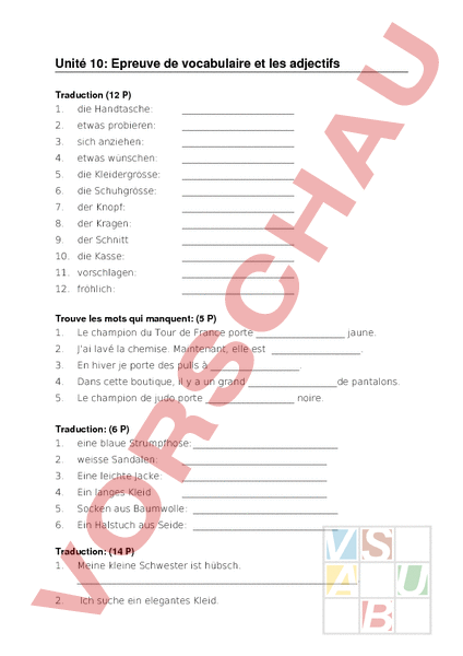 Unité 10: Epreuve de vocabulaire et les adjectifs Traduction (12 P) 1. die Handtasche: 2. etwas probieren: 3. sich anziehen: 4. etwas wünschen: 5. die Kleidergrösse: 6. die Schuhgrösse: 7. der Knopf: 8. der Kragen: 9. der Schnitt 10. die Kasse: 11. vorschlagen: 12. fröhlich: Trouve les mots qui manquent: (5 P) 1. Le champion du Tour de France porte jaune. 2. Jai lavé la chemise. Maintenant, elle est. 3. En hiver je porte des pulls à. 4. Dans cette boutique, il a un grandde pantalons. 5. Le champion de judo porte noire. Traduction: (6 P) 1. eine blaue Strumpfhose: 2. weisse Sandalen: 3. Eine leichte Jacke: 4. Ein langes Kleid 5. Socken aus Baumwolle: 6. Ein Halstuch aus Seide: Traduction: (14 P) 1. Meine kleine Schwester ist hübsch. . 2. Ich suche ein elegantes Kleid. . 3. Du ziehst eine schöne Krawatte an. . 4. Haben Sie bequeme Schuhe? . 5. Corinne sucht einen dicken Wollpullover. . 6. Sivlie trägt eine gestreifte Bluse. . 7. Ich trage ein kurzärmliges Hemd. . Punkte Max.: 37 Punkte Deine Punktzahl: Note: