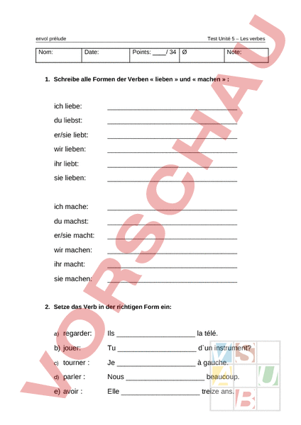 envol prélude Nom: Test Unité 5 – Les verbes Date: Points: / 34 Ø Note: 1. Schreibe alle Formen der Verben « lieben » und « machen » ich liebe: du liebst: er/sie liebt: wir lieben: ihr liebt: sie lieben: ich mache: du machst: er/sie macht: wir machen: ihr macht: sie machen: 2. Setze das Verb in der richtigen Form ein: a) regarder: b) jouer: Ils la télé. Tu dun instrument? c) tourner Je à gauche. d) parler Nous beaucoup. e) avoir Elle treize ans. f) chercher Quest-ce que vous 3. Verneine die folgenden Sätze a) Tu aimes la musique b) Jai deux sœurs c) Il est loncle de Lucie d) Nous faisons du ski e) Vous invitez une amie f) Elles bougent le bras 4. Beantworte die folgenden Fragen mit Nein: (Achtung: Das Personalpronomen wechselt manchmal bei der Antwort und damit verändert sich natürlich auch die Form des Verbs!) Beispiel: Est-ce que tu plies le genou? Non, je ne plie pas le genou. a) Est-ce que tu aimes la couleur jaune? b) Est-ce que vous tournez la tête? c) Est-ce quelle joue à lordinateur d) Est-ce que vous faites de la luge e) Est-ce quils parlent langlais