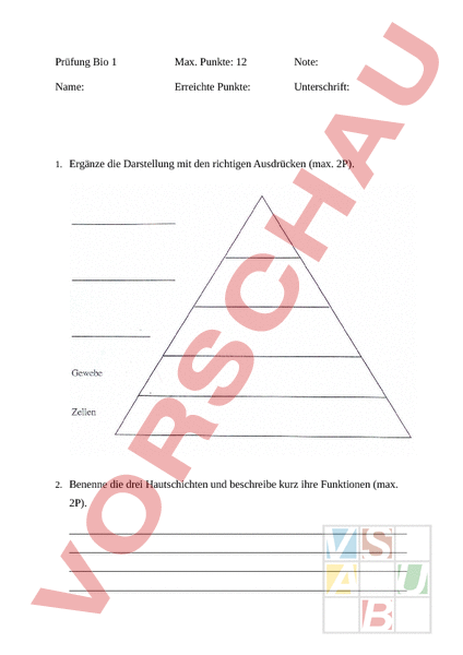 Prüfung Bio 1 Max. Punkte: 12 Note: Name: Erreichte Punkte: Unterschrift: 1. Ergänze die Darstellung mit den richtigen Ausdrücken (max. 2P). 2. Benenne die drei Hautschichten und beschreibe kurz ihre Funktionen (max. 2P). 3. Benenne die mit bis gekennzeichneten Teile (max. 3P). A:_ B:_ C:_ D:_ E:_ F: G: H: I:_ 4. Erkläre warum sich die Haare im Alter weiss verfärben (max. 1P). 5. Wie viele Talgdrüsen und Schmerzpunkte befinden sich auf 1cm2 Haut (max.0.5P)? 6. Erkläre für was die Polizei den Fingerabdruck verwenden kann (max. 0.5P). 7. Wie nennt man Tiere/ Menschen die weisse Haare und rote Augen haben (max. 0.5P)? 8. Wie viel Haare bedecken einen durchschnittlichen Kopf (max. 0.5P)? 9. Finde: a. Den Namen des beschriebenen Parasiten (siehe unten) A: b. Den Namen des gezeigten Parasiten (Max. 2P). B:_