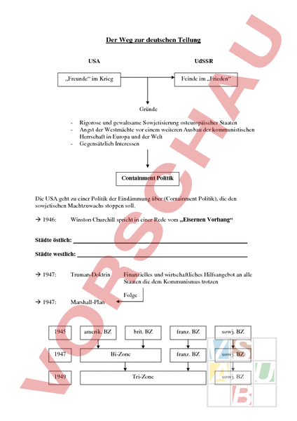 Der Weg zur deutschen Teilung USA UdSSR „Freunde im Krieg Feinde im „Frieden Gründe Rigorose und gewaltsame Sowjetisierung osteuropäischer Staaten Angst der Westmächte vor einem weiteren Ausbau der kommunistischen Herrschaft in Europa und der Welt Gegensätzlich Interessen Containment Politik Die USA geht zu einer Politik der Eindämmung über (Containment Politik), die den sowjetischen Machtzuwachs stoppen soll. 1946: Winston Churchill spricht in einer Rede vom „Eisernen Vorhang Städte östlich: Städte westlich: 1947: Truman-Doktrin Finanzielles und wirtschaftliches Hilfsangebot an alle Staaten die dem Kommunismus trotzen Folge 1947: 1945 1947 1949 Marshall-Plan amerik. BZ brit. BZ Bi-Zone Tri-Zone franz. BZ sowj. BZ franz. BZ sowj. BZ sowj. BZ