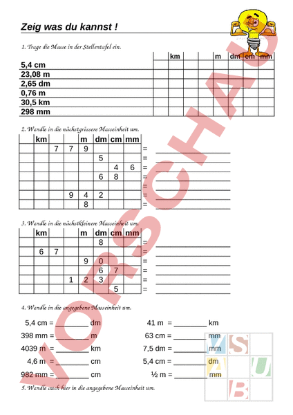 Zeig was du kannst 1. Trage die Masse in der Stellentafel ein. km 5,4 cm 23,08 2,65 dm 0,76 30,5 km 298 mm 2. Wandle in die nächstgrössere Masseinheit um. km 7 dm cm mm 7 9 5 4 6 6 8 9 4 2 8 3. Wandle in die nächstkleinere Masseinheit um. km 6 7 1 dm cm mm 8 9 0 6 7 2 3 5 4. Wandle in die angegebene Masseinheit um. 5,4 cm dm 41 km 398 mm 63 cm mm 4039 km 7,5 dm mm 4,6 cm 982 mm cm 5,4 cm dm mm 5. Wandle auch hier in die angegebene Masseinheit um. dm cm mm km 1 4 dm cm mm 3 4 8 1 5 8 4 2 9 6 8 6. Setze das passende Zeichen km cm mm dm km 1 km 66 4,7 cm 3m 5200 765 dm 47 dm 33 cm 4,7 km 0,463 6 km 53,2 dm 4700 463 cm 6500 532 mm 4 cm 44 mm 53 mm 5,3 dm 5m 50 cm 39 cm 3,9 dm