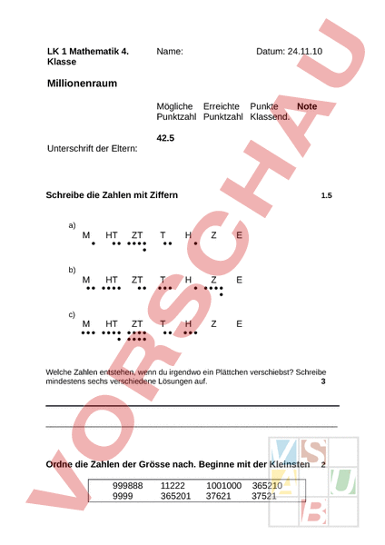 LK 1 Mathematik 4. Klasse Name: Datum: 24.11.10 Millionenraum Mögliche Erreichte Punkte Note Punktzahl Punktzahl Klassend. 42.5 Unterschrift der Eltern: Schreibe die Zahlen mit Ziffern 1.5 a) HT ZT b) HT ZT c) HT ZT Welche Zahlen entstehen, wenn du irgendwo ein Plättchen verschiebst? Schreibe mindestens sechs verschiedene Lösungen auf. 3 Ordne die Zahlen der Grösse nach. Beginne mit der Kleinsten 999888 9999 11222 365201 1001000 37621 365210 37521 2 Mit Tausendern rechnen. 539 777 6 539‘000 777‘000 539000 777000 685 – 249 685‘000 – 249‘000 685000 – 249000 Ergänze zum nächsten Tausender a) 5 280 1 488 607 7 496 23 045 Ergänze zum nächsten Hunderttausender a) 5 214 670 467 467 842 44 082 5 918 Zählen in Schritten 7 5970 5980 148 00 158000 . 17400 20100 22700 Schreibe die Nachbarszahlen auf. 4 . 999999 . 300 00 100 00 .669669 Schreibe die Nachbars-Tausender auf. 54238 1 .99231 Schreibe die Nachbars-Hunderttausender auf. .689329 1 .888888 Vergleiche. oder oder a) 34 321 34 312 90 238 4 b) 168 319 168 913 9 238 907 263 907 263 23 793 32 793 800 498 804 498 93 004 93 040 632 297 632 972 Beschrifte die Zahlen am Zahlenstrahl! 3 a) Hunderttausenderschritte 0 b) Zehnerschritte 500 00 1 00000 999901 1 00000 999950 c) In 8 Schritten bis auf 100‘000 0 1 00000 Viel Glück
