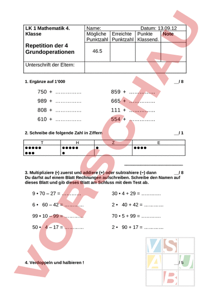 LK 1 Mathematik 4. Klasse Repetition der 4 Grundoperationen Name: Datum: 13.09.12 Mögliche Erreichte Punkte Note Punktzahl Punktzahl Klassend. 46.5 Unterschrift der Eltern: 1. Ergänze auf 1000 / 8 750 859 989 665 808 111 610 554 2. Schreibe die folgende Zahl in Ziffern / 1 3. Multipliziere (•) zuerst und addiere () oder subtrahiere () dann / 8 Du darfst auf einem Blatt Rechnungen aufschreiben. Schreibe den Namen auf dieses Blatt und gib dieses Blatt am Schluss mit dem Test ab. 9 • 70 – 27 30 • 4 29 6 • 60 – 42 2 • 40 42 99 • 10 – 99 70 • 5 99 50 • 4 – 17 2 • 90 17 4. Verdoppeln und halbieren / 5 Zahl Das Doppelte 250 320 895 736 278 136 488 334 156 520 b. Zahl Die Hälfte 5. Rechne mit dem Malkreuz. Schreibe es hin, wenn du willst. 8 16 4 19 13 16 14 18 17 13 18 12 6. Schönes Päckchen. Setze fort 60 30 /6 /5.5 1000 100 160 40 810 90 300 50 640 80 480 :60 490 70 360 60 7. Zahlenmauern /13 333 85 38 12 56 134 23 Viel Erfolg 157 88
