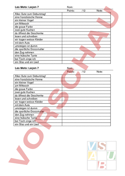 Les Mots: Leçon 7 Nom: Points: /12 Note: Nom: Points: /12 Note: Alles Gute zum Geburtstag! eine französische Henne ein kleiner Vogel am Mittwoch die graue Farbe zwei gute Kuchen du öffnest die Geschenke lesen und schreiben wir tragen weisse Kleider mit dem Auto umsteigen ist dumm die sportliche Grossmutter den Zug nehmen eine hübsche Tante bei Tisch singe ich ein Glas und ein Lied Les Mots: Leçon 7 Alles Gute zum Geburtstag! eine französische Henne ein kleiner Vogel am Mittwoch die graue Farbe zwei gute Kuchen du öffnest die Geschenke lesen und schreiben wir tragen weisse Kleider mit dem Auto umsteigen ist dumm die sportliche Grossmutter den Zug nehmen eine hübsche Tante bei Tisch singe ich ein Glas und ein Lied
