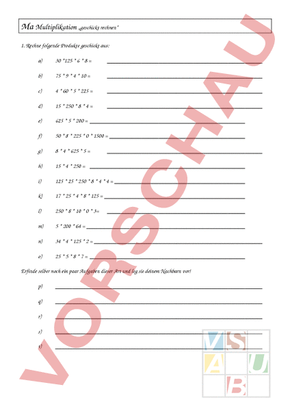 Ma Multiplikation „geschickt rechnen 1. Rechne folgende Produkte geschickt aus: a) 30 *125 6 8 b) 75 9 4 10 c) 4 60 5 225 d) 15 250 8 4 e) 625 5 200 f) 50 8 225 0 1500 g) 8 4 625 5 h) 15 4 250 i) 125 25 250 8 4 4 k) 17 25 4 8 125 l) 250 8 10 0 3 m) 5 200 64 n) 34 4 125 2 o) 25 5 8 7 Erfinde selber noch ein paar Aufgaben dieser Art und leg sie deinem Nachbarn vor! p) q) r) s) t)