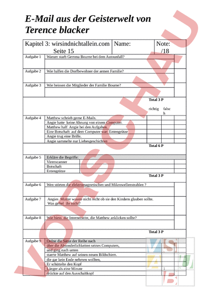 E-Mail aus der Geisterwelt von Terence blacker Kapitel 3: wirsindnichtallein.com Name: Seite 15 Aufgabe 1 Warum starb Gemma Bourne bei dem Autounfall? Sie ertrank. Aufgabe 2 Wie halfen die Dorfbewohner der armen Familie? Sie liessen sie in Ruhe. Aufgabe 3 Wie heissen die Mitglieder der Familie Bourne? Vater Stephan, Tochter Catherine, Sohn Matthew Note: /18 Total 3 richtig Aufgabe 4 Aufgabe 5 Matthew schrieb gerne E-Mails. Angie hatte keine Ahnung von einem Computer. Matthew half Angie bei den Aufgaben. Eine Botschaft auf dem Computer war: Entengrütze Angie trug eine Brille. Angie sammelte nur Liebesgeschichten falsc x x x Total 6 Erkläre die Begriffe: Virenscanner Ein Programm, das Viren entfernt. Botschaft Mitteilung Entengrütze Entenfütter Total 3 Aufgabe 6 Wen störten die elektromagnetischen und Mikrowellenstrahlen Die Geister, Spukerscheinungen, Poltergeister Aufgabe 7 Angies Mutter wusste nicht recht ob sie den Kindern glauben sollte. Was gefiel ihr nicht? Sie merkt, dass die Kinder ihr etwas verheimlichen. Aufgabe 8 Wie hiess die Internetseite, die Matthew anklicken sollte? wirsindnichtallein.com Total 3 Aufgabe 9 Ordne die Sätze der Reihe nach über die Absonderlichkeiten seines Computers, und ging nach unten starrte Matthew auf seinen neuen Bildschirm. die gar kein Ende nehmen wollten, Er schüttelte den Kopf Länger als eine Minute drückte auf den Ausschaltkopf 4 7 2 5 3 1 6 Total 3 Kapitel 3: wirsindnichtallein.com Seite 15 Name: Aufgabe 1 Warum starb Gemma Bourne bei dem Autounfall? Sie ertrank. Aufgabe 2 Wie halfen die Dorfbewohner der armen Familie? Sie liessen sie in Ruhe. Aufgabe 3 Wie heissen die Mitglieder der Familie Bourne? Vater Stephan, Tochter Catherine, Sohn Matthew Note: /18 Total 3 Aufgabe 4 Matthew schrieb gerne E-Mails. Angie hatte keine Ahnung von einem Computer. Matthew half Angie bei den Aufgaben. Eine Botschaft auf dem Computer war: Entengrütze Angie trug eine Brille. Angie sammelte nur Liebesgeschichten richtig falsch x x Total 6 Aufgabe 5 Erkläre die Begriffe: Virenscanner Botschaft Entengrütze Ein Programm, das Viren entfernt. Mitteilung Entenfutter Total 3 Aufgabe 6 Wen störten die elektromagnetischen und Mikrowellenstrahlen Die Geister, Spukerscheinungen, Poltergeister Aufgabe 7 Angies Mutter wusste nicht recht ob sie den Kindern glauben sollte. Was gefiel ihr nicht? Sie merkte, dass die Kinder ihr etwas verheimlichten. Aufgabe 8 Wie hiess die Internetseite, die Matthew anklicken sollte? wirsindnichtallein.com Total 3 Aufgabe 9 Ordne die Sätze der Reihe nach über die Absonderlichkeiten seines Computers, und ging nach unten starrte Matthew auf seinen neuen Bildschirm. die gar kein Ende nehmen wollten, Er schüttelte den Kopf Länger als eine Minute drückte auf den Ausschaltkopf 4 7 2 5 3 1 6 Total 3