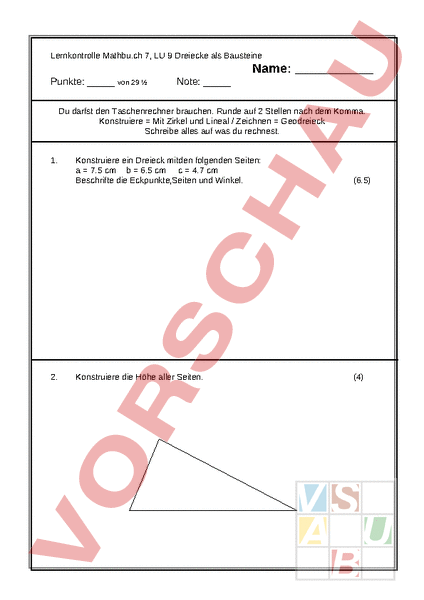 Lernkontrolle Mathbu.ch 7, LU 9 Dreiecke als Bausteine Name: Punkte: von 29 Note: Du darfst den Taschenrechner brauchen. Runde auf 2 Stellen nach dem Komma. Konstruiere Mit Zirkel und Lineal Zeichnen Geodreieck Schreibe alles auf was du rechnest. 1. 2. Konstruiere ein Dreieck mitden folgenden Seiten: 7.5 cm 6.5 cm 4.7 cm Beschrifte die Eckpunkte,Seiten und Winkel. (6.5) Konstruiere die Höhe aller Seiten. (4) 3. Zeichne die Höhen ein, miss sie (schreib sie auf) und berechne die Fläche.(9) 4. Unterteile die Vielecke in Dreiecke und berechne somit die Fläche der Figuren. (10) 27 6 21 5 15 4 93