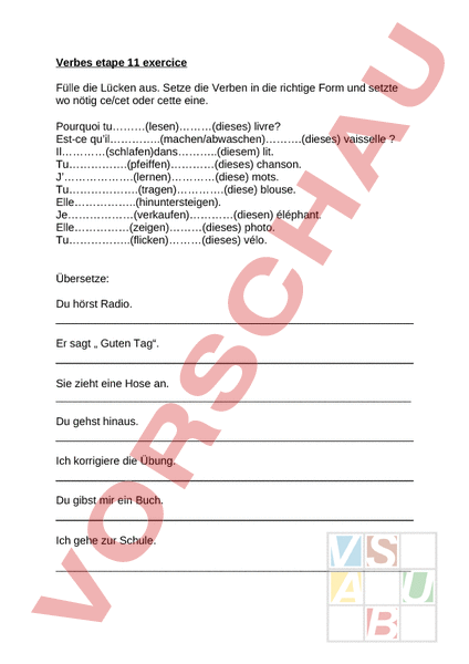 Verbes etape 11 exercice Fülle die Lücken aus. Setze die Verben in die richtige Form und setzte wo nötig ce/cet oder cette eine. Pourquoi tu(lesen)(dieses) livre? Est-ce quil(machen/abwaschen).(dieses) vaisselle Il(schlafen)dans(diesem) lit. Tu.(pfeiffen)(dieses) chanson. J.(lernen)(diese) mots. Tu.(tragen).(diese) blouse. Elle(hinuntersteigen). Je(verkaufen)(diesen) éléphant. Elle(zeigen)(dieses) photo. Tu(flicken)(dieses) vélo. Übersetze: Du hörst Radio. Er sagt „ Guten Tag. Sie zieht eine Hose an. Du gehst hinaus. Ich korrigiere die Übung. Du gibst mir ein Buch. Ich gehe zur Schule.