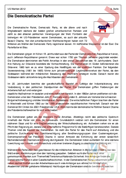 USWahlen 2012 3. Stufe Die Demokratische Partei Die Demokratische Partei, Democratic Party, ist die ältere und nach Mitgliederzahl stärkere der beiden großen amerikanischen Parteien und zählt zu den ältesten politischen Vereinigungen der Welt. Fünfzehn der bisherigen 44 USPräsidenten waren Demokraten, so auch der aktuelle Barack Obama. Von den amerikanischen Wahlberechtigten haben sich 72 Millionen als Wähler der Democratic Party registrieren lassen. Ihr inoffizielles Wappentier ist der Esel. Die Parteifarbe ist Blau. Die Demokraten gingen im frühen 19. Jahrhundert aus der Partei der Demokratischen Republikaner hervor, auch JeffersonRepublikaner genannt. Diese war schon 1792 von Thomas Jefferson gegründet worden. Die Demokraten dominierten die Politik Amerikas in den ersten Jahrzehnten des 19. Jahrhunderts. Doch ihre Haltung zur Sklaverei beendete die Vormachtstellung. Die Demokraten im Süden befürworteten die Sklaverei. 1860 kam es zu einer Spaltung des Nordflügels von der südlichen Fraktion. Der folgenden Sezessionskrieg (1861 bis 1865) führte zum jahrzehntelangen Legitimationsverlust der Partei, da den Südstaaten während der militärischen Besatzung das Wahlrecht entzogen wurde. Danach waren die Südstaaten dafür Jahrzehnte lang die Machtbastion der Demokraten. Im 20. Jahrhundert bewirkte der gesellschaftliche Wandel im Gefolge der Industrialisierung eine Veränderung in den politischen Standpunkten der Partei. Die Demokraten griffen Forderungen der Arbeiterschaft auf und verlangten staatliche Maßnahmen im sozialen und wirtschaftlichen Bereich. In den 1960er Jahren profilierten sich die Demokraten unter den Präsidenten John F. Kennedy und Lyndon B. Johnson als Vorreiter der schwarzen Bürgerrechtsbewegung und des linksliberalen Sozialstaats. Die wirtschaftlichen Folgen brachten die Partei in Misskredit und führten 1980 zur bis 1993 andauernden republikanischen Herrschaft. Danach war der Demokrat Bill Clinton bis 2001 Präsident der USA. 2008 konnte der demokratische Politiker Barack Obama die Präsidentschaftswahlen für sich entscheiden. Die Demokraten gelten als die liberalere Partei Amerikas. Allerdings reicht das politische Spektrum innerhalb der Partei von links bis konservativ. Grundsätzlich setzten sich die Demokraten für einen stärkeren Staat und für eine Reglementierung der Wirtschaftsordnung ein. Außerdem sehen sie es als Pflicht der Regierung an, soziale und wirtschaftliche Programme für die Bedürftigen bereitzustellen. Soziale Themen sind die Bastion der Demokraten. So steht die Partei für das Recht auf Abtreibung und die politische Durchsetzung der Gleichberechtigung aller Bevölkerungsgruppen über Quotenregelungen. Dementsprechend hat Präsident Obama in seiner Amtszeit die Einführung der ersten tatsächlich flächendeckenden Krankenversicherung durchgesetzt. Die Demokraten treten außerdem für eine stärkere Gewichtung von Umwelt und Klimaschutz und einen breiteren Zugang zu akademischer Bildung ein. Während die Partei 2001 fast geschlossen für die militärischen Aktionen in Afghanistan stimmte, war das Bild bei den Abstimmungen über den Irakkrieg gespalten. Seitdem sucht die Partei nach einer gemeinsamen Position zum Themenfeld Terrorismus/Nationale Sicherheit. Ihre Anhänger findet die Demokratische Partei in allen Gesellschaftsschichten. In der Demokratischen Partei versammeln sich neben starken Kräften aus der Arbeiterklasse auch viele Anhänger aus ethnischen Minderheiten, Akademiker und der gehobene Mittelstand. Hochburgen der Demokraten sind die bevölkerungsreichen USWahlen 2012 3. Stufe Staaten an der Pazifikküste, der Nordosten des Landes und die Great LakesRegion, während die meisten kleineren Staaten des Binnenlandes von den Republikanern dominiert werden. Da die kleinen Staaten im Wahlmännergremium überrepräsentiert sind, benötigen demokratische Kandidaten tendenziell mehr Stimmen für einen Wahlsieg als die republikanischen. USWahlen 2012 3. Stufe Die Republikanische Partei Die Republikanische Partei, Republican Party, ist die zweitgrößte Partei in den Vereinigten Staaten. Sie wird auch Grand Old Party, kurz GOP, genannt und hat bisher 18 der 44 amerikanischen Präsidenten gestellt. 55 Millionen Amerikaner haben sich als republikanische Wähler registrieren lassen. Das Symbol der Partei ist der Elefant. Die Parteifarbe ist Rot. Gegründet wurde die Republikanische Partei 1854 von Abraham Lincoln und anderen Gegnern der Sklaverei. In die neu gegründete Partei traten auch viele Demokraten der Nordstaaten ein, die sich an der zunehmenden Dominanz der Südstaaten in ihrer Partei störten. Nur sechs Jahre später, 1860, wurde Abraham Lincoln zum ersten republikanischen Präsidenten gewählt und brach damit die seit Jahren bestehende Vorherrschaft der Demokraten. 1865 gelang es den Republikanern, gegen die Stimmen der Demokraten, die Sklaverei auf dem Gebiet der gesamten Vereinigten Staaten abzuschaffen. Nach dem Bürgerkrieg dominierten die Republikaner über fünfzig Jahre lang die amerikanische Politik. In dieser Zeit standen die Republikaner und ihre Präsidenten für wirtschaftlichen Fortschritt, sie waren die Partei des kapitalistischen Bürgertums und stützten sich vor allem auf die industriellen Nordstaaten. Während der beiden Weltkriege und 19451952 war die Republikaner Oppositionspartei. Seit ihrer Gründung stellten sie die überwiegende Mehrheit der amerikanischen Präsidenten. Der letzte republikanische Präsident war Georg W. Bush. Heute gelten die Republikaner als wirtschaftsliberal und konservativ. Das bedeutet, sie treten für eine privatwirtschaftliche Gesellschaftsordnung mit möglichst wenig staatlichen Regulierungen ein und sprechen sich für Steuersenkungen aus. Sozialstaatliche Maßnahmen stehen sie dagegen äußerst zurückhaltend bis ablehnend gegenüber. Auch den Umweltschutz sehen viele Republikaner kritisch. Sie bezweifeln, dass der Klimawandel durch die Menschen verursacht wird und befü