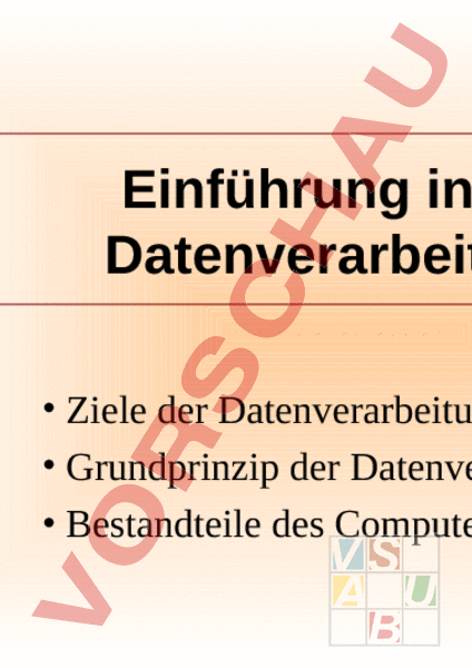 Einführung in die Datenverarbeitung • Ziele der Datenverarbeitung • Grundprinzip der Datenverarbeitung • Bestandteile des Computersystems Ziele der Datenverarbeitung • Schnelle Verarbeitung großer Datenmengen • Beseitigung monotoner Routinetätigkeiten • Höhere Wirtschaftlichkeit durch geringere Personal- und Sachkosten • Mehr und schnellere Informationen über Vorgänge (besseres Informationssystem) • Bessere Kommunikation durch Integration und Vernetzung von Aufgaben und Funktionen Grundprinzip der Datenverarbeitung Eingabe (E) Verarbeitung (V) Ausgabe (A) Zur Verarbeitung benötigt jeder Computer eine Zentraleinheit. Diese entscheidet über die Leistungsfähigkeit des Computersystems. Hauptbestandteile: Zentraleinheit (CPU und Arbeitsspeicher) Peripheriegeräte Konfiguration •Jeder Computer wird für viele verschiedene Aufgaben und Anwendungen eingesetzt. Jede Anwendung erfordert eine bestimmte Hardware. •Eine Computer-Hardware (Geräte-Zusammenstellung) für eine bestimmte Anwendung wird als Konfiguration bezeichnet. •Tragen Sie alle Ihnen bekannten Eingabe-, Ausgabegeräte, externe Speichereinheiten und Kommunikationseinrichtungen zusammen! Eingabe Tastatur Maus Joystick Scanner Berührungsempfindlicher Bildschirm Zeichentablett/Lichtstift Magnetkartenleser Formularleser Telefon Mikrofon Ausgabe Monitor Drucker Zeichenmaschine (Plotter) Signalgeber Lautsprecher Display Externe Speichereinheiten ISDN-Anschluss Modem Netzwerkkarten Diskettenstation Festplatte (Harddisk) Magnetbandstation (Streamer) CD-Laufwerk DVD-Laufwerk Kommunikationseinrichtungen Damit ein Computer Daten verarbeiten kann, sind drei Bestandteile eines Computersystems erforderlich: e ta d te ile o p te s s te H rd a re ir w r o ftw re e rä te z B Z n r le n e t M n it r, a ta tu e r ie s y t m oder e r ie s r g a m ü G u d u k io e n e d rp ro ra m z .B fü A ftra s e r e it n Software Systemsoftware Betriebssystem Anwendersoftware Standardsoftware • Universell • • • • Steuerprogramme (z. B. Diskettensteuerprogramm) Sprachübersetzer/Programmiersprachen (z. B. BASIC) Dienstprogramme/Utilities (z. B. Virenscanner) Generatoren zur automatischen Erstellung von Computeranwendungen Benutzeroberflächen • • • • Textverarbeitung Tabellenkalkulation Datenbanken Geschäftsgrafiken Funktionell • • • • Auftragsbearbeitung Finanzbuchhaltung Lager/Bestellwesen Lohn und Gehalt Branchensoftware für Ärzte, Baugewerbe, Einzelhandel, Reiseunternehmen, . Individualsoftware