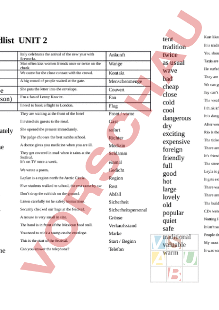 Wordlist UNIT 2 arrival cheek contact crowd envelope fan (person) flight front guest immediately judge medicine mud once poem region rest rubbish safety security size stall stamp start telephone Italy celebrates the arrival of the new year with fireworks. Men often kiss women friends once or twice on the cheek. We come for the close contact with the crowd. Ankunft big crowd of people waited at the gate. Menschenmenge She puts the letter into the envelope. Couvert Im fan of Lenny Kravitz. Fan need to book flight to London. Flug They are waiting at the front of the hotel Front vorne invited six guests to the meal. Gast She opened the present immediately. sofort The judge chooses the best samba school. Richter doctor gives you medicine when you are ill. Medizin They get covered in mud when it rains at the festival. Its on TV once week. Schlamm We wrote poem. Gedicht Laplan is region north the Arctic Circle. Region Five students walked to school, the rest came by car Rest Dont drop the rubbish on the ground. Abfall Listen carefully tot he safety instructions. Sicherheit Security checked our bags at the festival. Sicherheitspersonal mouse is very small in size. Grösse The band is in front of the Mexican food stall. Verkaufsstand You need to stick stamp on the envelope. Marke This is the start of the festival. Start Beginn Can you answer the telephone? Telefon Wange Kontakt einmal tent tradition twice as usual wave bad cheap close cold cool dangerous dry exciting expensive foreign friendly full good hot large lovely old popular quiet safe traditional valuable warm Kurt likes sleeping in tent. Zelt It is tradition to put candle in the window. Tradition You shoul kiss them twice on the cheeks. zweimal Taxis are four times as expensive as ususal. wie gewöhnlich He surfed on the big wave. Welle They are bad at starting on time. schlecht We can get cheap tickets. billig Jay cant close his suitcase. schliessen The weather is extremely cold. kalt think its really cool. cool It is dangerous to walk on the road. gefährlich After weeks without rain, everything was very dry. trocken Rio is the most exciting city in the world. aufregend The tickets are very expensive. teuer There are 3000 foreign visitors. ausländisch Its friendly to smile at strangers. freundlich The streets are full of people. voll Leyla is good at dancing gut It gets extremely hot in summer. heiss There was large crowd of people at the festival. gross There are lovely people at festivals. reizend The building is very old alt CDs were more popular than cassettes. beliebt Notting Hill is quiet part of London. ruhig It isnt safe to go off on your own. sicher People drink sake, traditional Japanese rice wine. traditionell My most valuable possession is my mobile phone. wertvoll It was warm so we sat outside. warm wet ball celebrate candle festival New Years Eve party present show stage wine rock soul world behind between inside near opposite outside over under bank hotel post office supermarket bring It rained and we got very wet. We will dance at the ball. Most people celebrate New Year with their family. They light candle at New Year. The music is fantastic at the festival. nass (Tanz)Ball feiern Kerze Festival In Brazil, people wear white clothes on New Year‘s Eve. Silvester Did you have fun at the party? Party James gave me birthday present. Geschenk It is very popular TV show. Show The band came onto the stage. Bühne People often drink wine to celebrate. Wein Rock is played with electric guitars and drums. Rock Soul is African-American music and singing. Soul There are stalls from all over the world. Welt The thin man is standing behind the girl. hinter Theres 8 hours difference between London and California. Its warm inside the house. zwischen The famous church is near the monument. nah The post office is opposite the bank. gegenüber Most people escaped to the fields outside the city. draussen There are lots of bridges over the river Thames. über People have picnics under the cherry trees. unter want to change some money at the bank. (Geld)Bank Do you stay in hotel? Hotel Take your letter to the post office. Post You can get some rice at the supermarket. Supermarkt Remember to bring your phone. bringen innen burn cover last (v) light (v) ring (v) sleep (v) throw (v) You burn candle to give light. brennen Water covers more than two thirds of the Earth. bedecken In China, New Year celebrations last 15 days. dauern We should light candle. anzünden The bell rings 108 times. läuten klingeln We are going to sleep in tent. schlafen They throw flowers into the sea. werfen