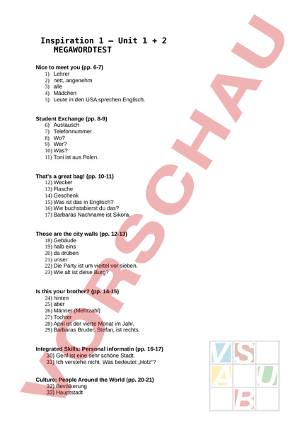 Inspiration 1 – Unit 1 2 MEGAWORDTEST Nice to meet you (pp. 6-7) 1) Lehrer 2) nett, angenehm 3) alle 4) Mädchen 5) Leute in den USA sprechen Englisch. Student Exchange (pp. 8-9) 6) Austausch 7) Telefonnummer 8) Wo? 9) Wer? 10) Was? 11) Toni ist aus Polen. That great bag! (pp. 10-11) 12) Wecker 13) Flasche 14) Geschenk 15) Was ist das in Englisch? 16) Wie buchstabierst du das? 17) Barbaras Nachname ist Sikora. Those are the city walls (pp. 12-13) 18) Gebäude 19) halb eins 20) da drüben 21) unser 22) Die Party ist um viertel vor sieben. 23) Wie alt ist diese Burg? Is this your brother? (pp. 14-15) 24) hinten 25) aber 26) Männer (Mehrzahl) 27) Tochter 28) April ist der vierte Monat im Jahr. 29) Barbaras Bruder, Stefan, ist rechts. Integrated Skills: Personal informatin (pp. 16-17) 30) Genf ist eine sehr schöne Stadt. 31) Ich verstehe nicht. Was bedeutet „Holz? Culture: People Around the World (pp. 20-21) 32) Bevölkerung 33) Hauptstadt 34) Die Hauptsprache von Brasilien ist Portugiesisch. Can have my phone back? (pp. 22-23) 35) Hose 36) Hemd 37) böse, verärgert 38) Kierans Mutter hat kurze rote Haare. 39) Das Mädchen rechts im Bild hat weisse Schuhe. can play the guitar (pp.24-25 40) Lichtschalter 41) sich erinnern 42) sprechen 43) gehen 44) Kannst du unter Wasser schwimmen? 45) Ich kann nicht 20 Kilogramm hochheben. Dont move (pp. 26-27) 46) wählen (Telefon) 47) vergessen 48) jemand 49) morgen 50) Auslandvorwahl 51) Benutze dein Handy in der Klasse nicht. 52) Vielen Dank, Maria. 53) Jetzt kannst du ein Bild machen. Integrated skills: Favourite band (pp. 28-29) 54) immer 55) berühmt 56) Wie viele? 57) schliessen 58) Kann ich das Fenster öffnen? 59) Ihre Webseite hat auch einen Laden. 60) Er kann das Zimmer verlassen.