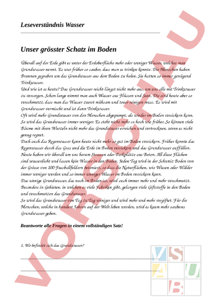 Leseverständnis Wasser Unser grösster Schatz im Boden Überall auf der Erde gibt es unter der Erdoberfläche mehr oder weniger Wasser, welches man Grundwasser nennt. Es war früher so sauber, dass man es trinken konnte. Die Menschen haben Brunnen gegraben um das Grundwasser aus dem Boden zu holen. Sie hatten so immer genügend Trinkwasser. Und wie ist es heute? Das Grundwasser reicht längst nicht mehr aus, um uns alle mit Trinkwasser zu versorgen. Schon lange nimmt man auch Wasser aus Flüssen und Seen. Die sind heute aber so verschmutzt, dass man das Wasser zuerst mühsam und teuer reinigen muss. Es wird mit Grundwasser vermischt und ist dann Trinkwasser. Oft wird mehr Grundwasser von den Menschen abgepumpt, als wieder im Boden versickern kann. So wird das Grundwasser immer weniger. Es steht nicht mehr so hoch wie früher. So können viele Bäume mit ihren Wurzeln nicht mehr das Grundwasser erreichen und vertrocknen, wenn es nicht genug regnet. Doch auch das Regenwasser kann heute nicht mehr so gut im Boden versickern. Früher konnte das Regenwasser durch das Gras und die Erde im Boden versickern und das Grundwasser auffüllen. Heute haben wir überall um uns herum Strassen oder Parkplätze aus Beton. All diese Flächen sind wasserdicht und lassen kein Wasser in den Boden. Jeden Tag wird in der Schweiz Boden von der Grösse von 100 Fussballfeldern betoniert, so dass die Naturflächen, wie Wiesen oder Wälder immer weniger werden und so immer weniger Wasser im Boden versickern kann. Das wenige Grundwasser, das noch im Boden ist, wird auch immer mehr und mehr verschmutzt. Besonders in Gebieten, in welchen es viele Fabriken gibt, gelangen viele Giftstoffe in den Boden und verschmutzen das Grundwasser. So wird das Grundwasser von Tag zu Tag weniger und wird mehr und mehr vergiftet. Für die Menschen, welche in hundert Jahren auf der Welt leben werden, wird es kaum mehr sauberes Grundwasser geben. Beantworte alle Fragen in einem vollständigen Satz! 1. Wo befindet sich das Grundwasser? 2. Wie war das Grundwasser früher und was haben die Menschen damit gemacht? 3. Aus welchen Wassern besteht unser Trinkwasser heute? 4. Wieso wird das Grundwasser immer weniger? 5. Wieso vertrocknen die Bäume, wenn es nicht genug regnet? 6. Was passiert mit dem Regenwasser, das auf die Erde trifft? 7. Warum kann das Regenwasser heute nicht mehr so gut im Boden versickern? 8. Wie gross sind die Flächen, welche jeden Tag in der Schweiz betoniert werden? 9. Das Grundwasser wird nicht nur immer weniger, sondern es gibt noch eine weitere Gefahr für das Grundwasser. Wieso ist das Grundwasser noch in Gefahr? 10. Was bedeutet es für die Menschen, welche in hundert Jahren auf der Erde leben werden, wenn es so weiter geht?