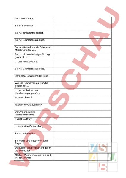 Sie macht Eislauf. Sie geht zum Arzt. Sie hat einen Unfall gehabt. Sie hat Schmerzen am Fuss. Sie bereitet sich auf die Schweizer Meisterschaften vor. Sie hat einen schwierigen Sprung gemacht und sie ist gestürzt. Sie hat Schmerzen am Fuss. Der Doktor untersucht den Fuss. Weil sie Schmerzen am Knöchel gehabt hat, hat der Trainer den Krankenwagen gerufen. Ist es ein Bruch? Ist es eine Verstauchung? Der Arzt macht eine Röntgenaufnahme. Es ist kein Bruch, . es ist eine Verstauchung. Sie hat keinen Gips. Sie macht eine Pause von zehn Tagen. Der Doktor gibt Medikament gegen die Schmerzen. Nächste Woche muss sie (elle doit) wieder kommen