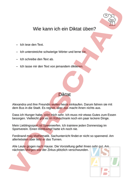 Wie kann ich ein Diktat üben? – Ich lese den Text. – Ich unterstreiche schwierige Wörter und lerne sie. – Ich schreibe den Text ab. – Ich lasse mir den Text von jemandem diktieren. Diktat Alexandra und ihre Freundin wollen heute einkaufen. Darum fahren sie mit dem Bus in die Stadt. Es regnet, aber das macht ihnen nichts aus. Dass ich Hunger habe, stört mich sehr. Ich muss mir etwas Gutes zum Essen besorgen. Vielleicht gibt es im Kühlschrank noch ein paar leckere Dinge. Mein Lieblingssport ist Speerwerfen. Ich trainiere jeden Donnerstag im Sportverein. Einen Wettkampf hatte ich noch nie. Ferdinand mag Mathematik. Sachunterricht findet er nicht so spannend. Am allerliebsten aber liebt er das Turnen. Alle Leute gingen nach Hause. Die Vorstellung gefiel ihnen sehr gut. Am nächsten Morgen war der Zirkus plötzlich verschwunden.
