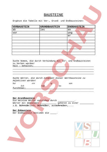 BAUSTEINE Ergänze die Tabelle mit Vor-, Grund- und Endbausteinen: VORBAUSTEIN ab vor GRUNDBAUSTEIN les ENDBAUSTEIN en ung er Suche Nomen, die durch Verbindung mit Vor- und Endbausteinen zu Verben werden! Halt – behalten; Suche Wörter, die durch Anhängen dieser Wortbausteine zu Adjektiven werden! bar ern ig sam lich haft los furchtbar; Der Grundbaustein Die meisten Wörter entstehen durch Wörter mit demselben gehören zu einer z.B. Schreibtisch, Schreiber, ausschreiben, Der Enbaustein Der Endbaustein bestimmt die