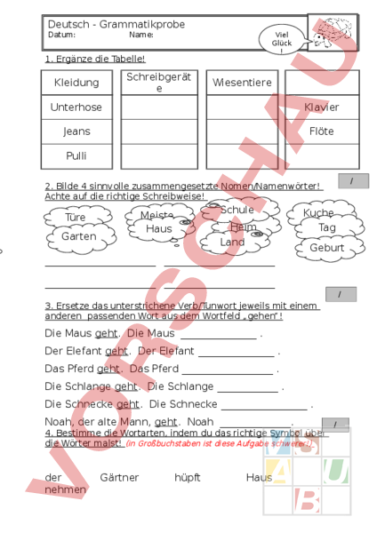 Deutsch Grammatikprobe Datum: Name: Viel Glück 1. Ergänze die Tabelle! Schreibgerät Kleidung Wiesentiere Unterhose Klavier Jeans Flöte Pulli 2. Bilde 4 sinnvolle zusammengesetzte Nomen/Namenwörter! Achte auf die richtige Schreibweise! Schule Meiste Haus Türe Garten Heim Land Kuche nTag Geburt 3. Ersetze das unterstrichene Verb/Tunwort jeweils mit einem anderen passenden Wort aus dem Wortfeld „gehen! Die Maus geht. Die Maus Der Elefant geht. Der Elefant Das Pferd geht. Das Pferd Die Schlange geht. Die Schlange Die Schnecke geht. Die Schnecke Noah, der alte Mann, geht. Noah . 4. Bestimme die Wortarten, indem du das richtige Symbol über die Wörter malst! (in Großbuchstaben ist diese Aufgabe schwerer!) der nehmen Gärtner hüpft Haus süß erdig Klara lieben Erde 5. Ein Wort und zwei Bedeutungen! Finde 2 Beispiele! Erkläre ihre beiden unterschiedlichen Bedeutungen kurz! 6. Adjektive/Wiewörter haben Gegenteile! Suche 3 weitere Beispiel! süß oder sauer 7. Verben haben unterschiedliche Formen! Ergänze! gehen du wir springen er ich werfen ich er 8. Ich fand alle Fragen leicht. Diese Fragen waren für mich schwer: Von . Punkten hast du Punkte erreicht. Das entspricht der Note Unterschrift der Eltern: Lösungen: 1. Ergänze die Tabelle! Kleidung Unterhose Jeans Pulli Schreibgeräte Füller Bleistift Kugelschreiber, Federhalter. Wiesentiere Schnecke Heuhüpfer Zecke, Schmetterling Instrumente Klavier Flöte Piano, Oboe, Geige 2. Bilde 4 sinnvolle zusammengesetzte Nomen/Namenwörter! Achte auf die richtige Schreibweise! Gartentüre Hausmeister Schullandheim Geburtstagskuchen 3. Ersetze das unterstrichene Verb/Tunwort jeweils mit einem anderen passenden Wort aus dem Wortfeld „gehen! Die Maus geht. Die Maus trippelt/läuft/tapst. Der Elefant geht. Der Elefant trampelt/ stampft/. Das Pferd geht. Das Pferd trabt/galoppiert/prescht/. Die Schlange geht. Die Schlange gleitet/schlängelt/ Die Schnecke geht. Die Schnecke kriecht/schleicht. Noah, der alte Mann, geht. Noah humpelt/ schlurft/. 4. Bestimme die Wortarten, indem du das richtige Symbol über die Wörter malst! DER SÜß GÄRTNER KLARA HÜPFT LIEBEN HAUS ERDE NEHMEN ERDIG 5. Ein Wort und zwei Bedeutungen! Finde 2 Beispiele! Erkläre ihre beiden unterschiedlichen Bedeutungen kurz! Flügel: ein Instrument und Körperteil eines Vogels Schloss: ein Märchenschloss und ein Türschloss Hahn: Gockelhahn und Wasserhahn, 6. Adjektive/Wiewörter haben Gegenteile! Suche 3 weitere Beispiel! hell und dunkel, groß und klein, schwer und leicht, 7. Verben haben unterschiedliche Formen! Ergänze! gehen du gehst, wir gehen springen er springt, ich springe werfen ich werfe, er wirft