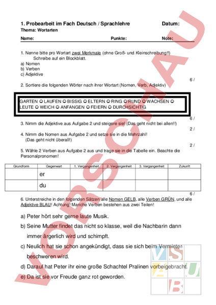 1. Probearbeit im Fach Deutsch Sprachlehre Datum: Thema: Wortarten Name: Punkte: Note: 1. Nenne bitte pro Wortart zwei Merkmale (ohne Groß und Kleinschreibung!!) Schreibe auf ein Blockblatt. a) Nomen b) Verben c) Adjektive 6/ 2. Sortiere die folgenden Wörter nach ihrer Wortart (Nomen, Verb, Adjektiv) GARTEN LAUFEN BISSIG ELTERN RING RUND WACHSEN LEUTE WEICH ANFANGEN FEIERN DURCHSICHTIG 6/ 3. Nimm die Adjektive aus Aufgabe 2 und steigere sie! (Das geht nicht bei allen!!) 2/ 4. Nimm die Nomen aus Aufgabe 2 und setze sie in die Mehrzahl! (Das geht nicht überall!) 5. Wähle 2 Verben aus Aufgabe 2 aus und trage sie in die Tabelle ein. Beachte die Personalpronomen! Grundform Gegenwart 1. Vergangenheit 2. Vergangenheit 3. Vergangenheit 2/ Zukunft er du 6/ 6. Unterstreiche in den folgenden Sätzen alle Nomen GELB, alle Verben GRÜN, und alle Adjektive BLAU! Achtung! Manche Verben bestehen aus zwei Teilen! a) Peter hört sehr gerne laute Musik. b) Seine Mutter findet das nicht so klasse, weil die Nachbarin dann immer ärgerlich wird und schimpft. c) Neulich hat sie schon angekündigt, dass sie sich beim Vermieter beschweren wird. d) Darauf hat Peter ihr eine große Schachtel Pralinen vorbeigebracht. e) Da ist sie vor Freude ganz rot geworden. f) Und hat gesagt, das sei alles gar nicht so schlimm gewesen. 15 Gesamt: 37 P. LÖSUNGEN 1a) Nomen: können einen Begleiter haben, Nachsilben heit, keit, nis, usw., Einzahl Mehrzahl, 4 Fälle, konkrete Dinge zum Anfassen, 1b) Verben: drücken eine Tätigkeit, Handlung aus, Frage: was passiert? Ändert sich mit den verschiedenen Personen, kann man in verschiedene Zeiten setzen 1c) Adjektive: beschreiben eine Eigenschaft, lassen sich steigern, erkennt man an Nachsilben –isch, ig, haft, ös, usw. 2. Nomen: Garten, Ring, Leute, Eltern V.: laufen, wachsen, anfangen, feiern A.: bissig, rund, weich, durchsichtig 3. bissig, weich – die anderen machen keinen Sinn! 4. Die Gärten, die Ringe 5. laufen – er läuft – er lief – er ist gelaufen – er war gelaufen – er wird laufen wachsen – er wächst – er wuchs – er ist gewachsen – er war gewachsen – er wird wachsen usw. 6. a) Peter hört sehr gerne laute Musik. (2 P.) b) Seine Mutter findet das nicht so klasse, weil die Nachbarin dann immer ärgerlich wird und schimpft. (3,5) c) Neulich hat sie schon angekündigt, dass sie sich beim Vermieter beschweren wird. (2,5) d) Darauf hat Peter ihr eine große Schachtel Pralinen vorbeigebracht. (2,5) e) Da ist sie vor Freude ganz rot geworden. (2) f) Und hat gesagt, das sei alles gar nicht so schlimm gewesen. (2,5)