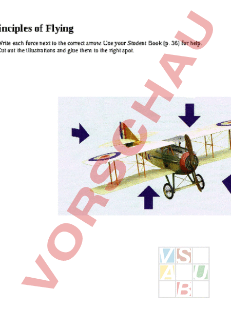 Principles of Flying 1. Write each force next to the correct arrow. Use your Student Book (p. 36) for help. 2. Cut out the illustrations and glue them to the right spot. Cut out the illustrations and glue them next to the correct arrow