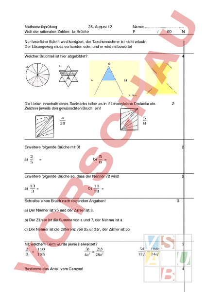 Mathematikprüfung 28. August 12 Welt der rationalen Zahlen: 1a Brüche Name: . / 60 Nur leserliche Schrift wird korrigiert, der Taschenrechner ist nicht erlaubt Der Lösungsweg muss vorhanden sein, und er wird mitbewertet Welcher Bruchteil ist hier abgebildet? 4 Die Linien innerhalb eines Rechtecks teilen es in flächengleiche Dreiecke ein. Zeichne jeweils den gewünschten Bruch ein! 4 20 2 5 8 Erweitere folgende Brüche mit 3! a) 2 5 2 b) 5 8 Erweitere folgende Brüche so, dass der Nenner 72 wird! a) 13 3 b) 2 11 18 Schreibe einen Bruch nach folgenden Angaben! 3 a) Der Nenner ist 25 und der Zähler ist 9. b) Der Zähler ist die Summe von und 7, der Nenner ist c) Der Nenner ist die Differenz von 25 und b2, der Zähler ist 5b Mit welchem Term wurde jeweils erweitert? 3b 21b 2 110 2 3 165 4a 28a 2 Bestimme den Anteil vom Ganzen! 3 5d 10de 12 24ef 4 1 von 230 dm3 dm3 5 7 von 450 kg kg 9 1 von 95 km 4 3 von 4 16 cm cm. 8 Kürze so weit wie möglich! a) 48 72 2 b) 120 420 Kürze die Terme 12 9 a) 27 2 b) c) d) e) f) g) h) 8 kl 2 34kl 2 mn 5a 15a 5a 6( 2c 4 ) 2 12( 2c 4d 28b 7 7 15 5x 5 9mr 27 2 18r 15 2 30 3 qr 3 pq 6 2 qr Färbe in den Kreisen ein Kuchenstück, das die angegebene Prozentzahl darstellt. 3 75% 12.5% 62.5% Ergänze die Tabelle Bruch 1 a) 5 30% 60% 85% 8 Dezimalzahl b) Prozentzahl 0.62 c) d) 56% 89 1000 Mache, wenn nötig, die Brüche gleichnamig und trage ein oder ein. a) 13 14 . 14 13 b) 2 5 6 15 c) 13 3 16 16 d) 10 8 12 20 4 Ordne die folgenden Zahlen der Grösse nach. Beginne mit der kleinsten Zahl! 11 5 5 12 Kürze die Brüche mit (1) 3) 5) 15 13 0.5 2.4 3 4 8 4 4b 7 9) 5a Schreibe 5 als Bruch mit dem Nenner 6. 2 Schreibe 3x als Bruch mit dem Nenner 3. Erweitere die Brüche so, dass sie den verlangten Nenner haben! Nenner: ab 2 5 b Nenner: 60x2y2z 4 x y2 2 Bestimme x! 91 36 42 2 12 51 x 34 Bestimme die Lösungen folgender Gleichungen! 1 von 340 dm3 16 von 156 km 117 km 4 2 Markiere 35% des Flächeninhalts des Rechtecks. Wie viele Prozente der Quadratfläche sind getönt? 12.5% Welcher gekürzte Bruchteil der Quadratfläche ist getönt? 1/16 Ergänze! Bedeutet kürzen mit 3 Bedeutet kürzen mit 2 Bedeutet kürzen mit 6 Welcher Bruchteil der gesamten Quadratfläche ist getönt?