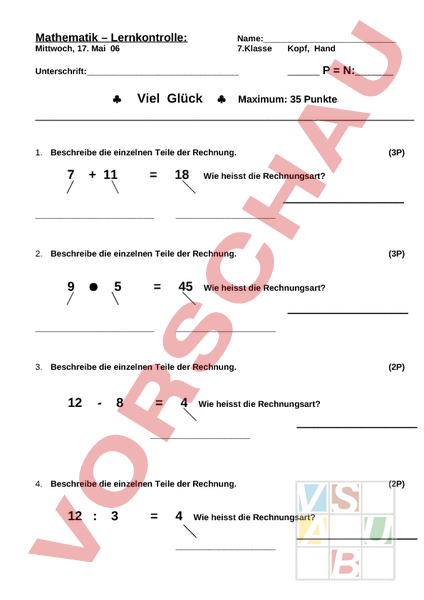 Mathematik – Lernkontrolle: Name: 7.Klasse Kopf, Hand Mittwoch, 17. Mai 06 Unterschrift: Viel Glück N: Maximum: 35 Punkte 1. Beschreibe die einzelnen Teile der Rechnung. 7 11 18 Wie heisst die Rechnungsart? 2. Beschreibe die einzelnen Teile der Rechnung. 9 5 45 8 (3P) Wie heisst die Rechnungsart? 3. Beschreibe die einzelnen Teile der Rechnung. 12 (3P) 4 (2P) Wie heisst die Rechnungsart? 4. Beschreibe die einzelnen Teile der Rechnung. 12 3 4 Wie heisst die Rechnungsart? (2P) 5. a) 0.2 • 0.06 b) 3 • 0.09 a) 0.8 • 0.9 (3P) 6. a) 40 0,8 b) 0.25 2 c) 0.24 0,6 (3P) 7. a) 0.07 0,15 b) 0.36 0,09 c) 0.88 0.131 8. Färbe die gleichen Brüche mit der gleichen Farbe an. 0.75 6 0.5 • 0.25 von von 3 0.3 • 0.75 9. (6P) : von 0.25 • 3 von 1/6 von 2 0,25 Berechne die Tabelle. • 320 32 3.2 0.32 (3P) 400 (4P) 40 4 10. Gib in gewöhnlichen Brüchen oder Dezimalzahlen an: a) 0.24 0.4 (6P) b) 16/80 c) 0.875 d) 48/64 e) 0.65 f) 36/90