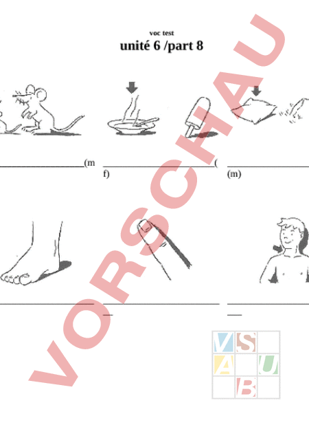 voc test unité 6 /part 8 nom: date: (m( f) (m) ( m) Le chat est lordinateur. Le chat est la bibliothèque la tête. la jambe. les mains . les mains. Bonne chance!!!
