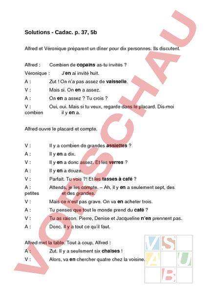 Solutions Cadac. p. 37, 5b Alfred et Véronique préparent un dîner pour dix personnes. Ils discutent. Alfred Combien de copains astu invités Véronique Jen ai invité huit. A: Zut On na pas assez de vaisselle. V: Mais si. On en assez. A: On en assez Tu crois V: combien Oui, oui. Mais si tu veux, regarde dans le placard. Dismoi il en a. Alfred ouvre le placard et compte. V: Il a combien de grandes assiettes A: Il en dix. V: Il en donc assez. Et les verres A: Il en douze. V: Parfait. Tu vois ?! Et les tasses à café A: petites Attends, je les compte. – Ah, il en seulement sept, des et des grandes. V: Mais ce nest pas grave. On va en acheter trois. A: Tu penses que tout le monde prend du café V: Tu as raison. Pierre, Denise et Jacqueline nen prennent pas. A: Donc. Il a tout ce quil faut. Alfred met la table. Tout à coup, Alfred A: Zut. Il a seulement six chaises V: Alors, va en chercher quatre chez la voisine.