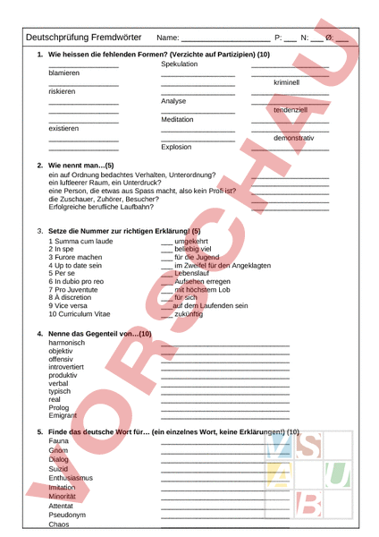 Arbeitsblatt: Deutschprüfung Wortschatz (Fremdwörter)